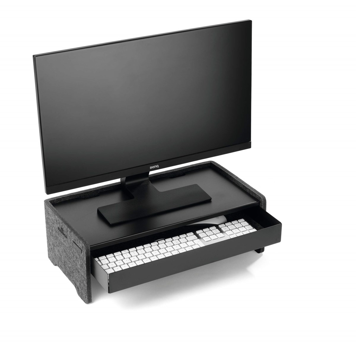 Med ett skärmställ hamnar datorskärmen på en bra ergonomisk höjd samtidigt som det frigör bordsyta. Kombinera med en låda för förvaring av pennor, dokument, kablar mm. EFFECT-serien som denna låda ingår i, tillverkas av metall och har en mjuk, ljuddämpande och tålig bottenmatta av filt. Filten är tillverkad av PET plast, varav 60% är av insamlad och återvunnen PETplast (rPET). Material från lådans botten har använts till två glidskenor, som fästs i skärmstället. Hålen efter dessa skenor täcks av filtmattan. Produkterna i serien är 100 % återvinningsbara och förpackas hållbart med resursbesparande och plastfria material. Maxbelastning 5 kg. Mått: 46,8 x 5,3 x 22,1 cm (BxHxD)