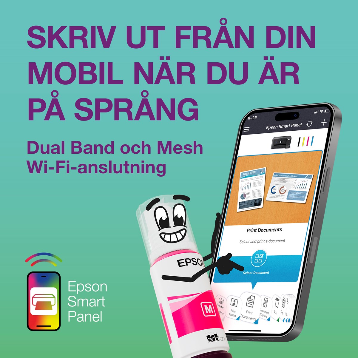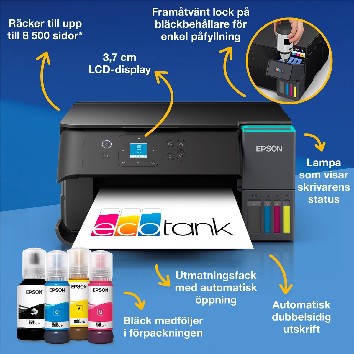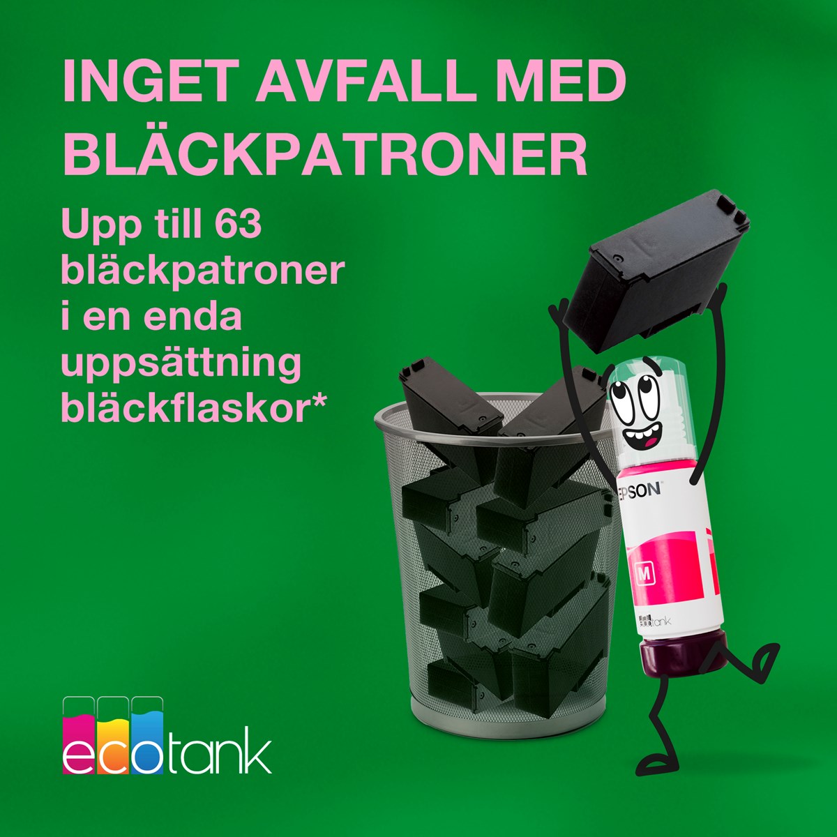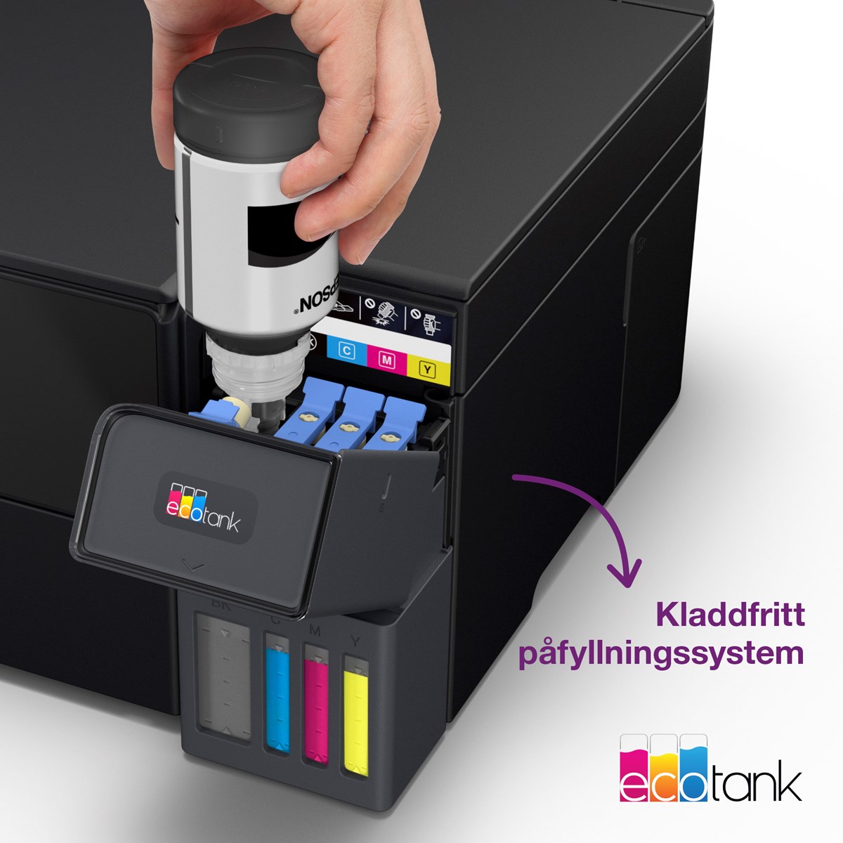 EcoTank ger problemfria hemutskrifter – de påfyllbara bläckbehållarna med extremt hög kapacitet ger en spillfri påfyllning och tillåter endast att korrekt färg fylls i i motsvarande behållare. Tack vare visning av bläcknivå på framsidan är det enkelt att se när det är dags för påfyllning.