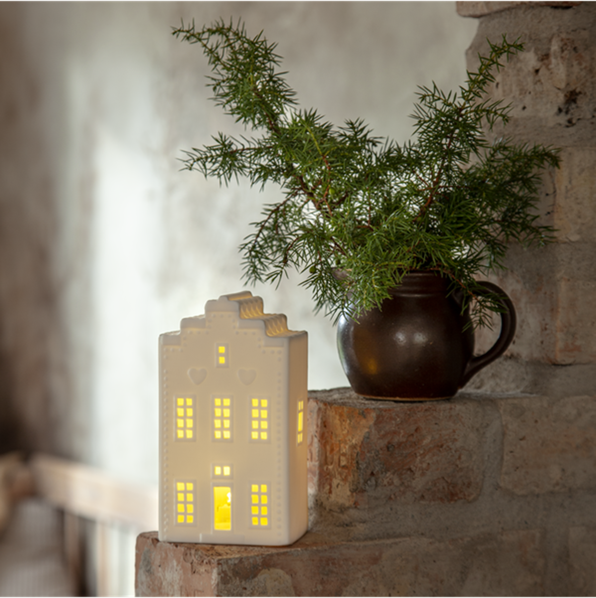 Ett vackert kanalhus i keramik för dekoration i hemmet. Lyser och sprider ett fint sken. För inomhusbruk. Timerfunktion. Drivs med 3 st AG13-batterier (medföljer).