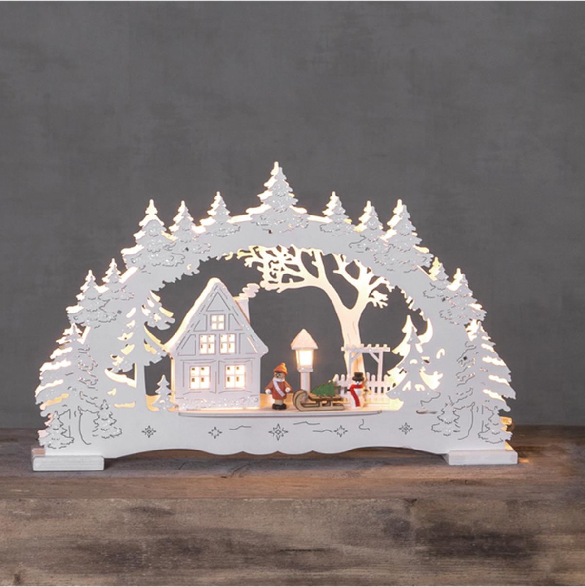 Fin lazer cut ljusstake med bymotiv. Ljusstaken har 10 stycken ljuskällor med varmvitt sken. Skapar en mysig adventkänsla i rummet med ett härligt sken. 3 batterier AA ingår ej. Lyser ca 1000 tim. med 10 led ljuskällor. Anslutningskabel 5 m. Transformator 5V DC 3W 600mA IP20 Euro-kontakt.