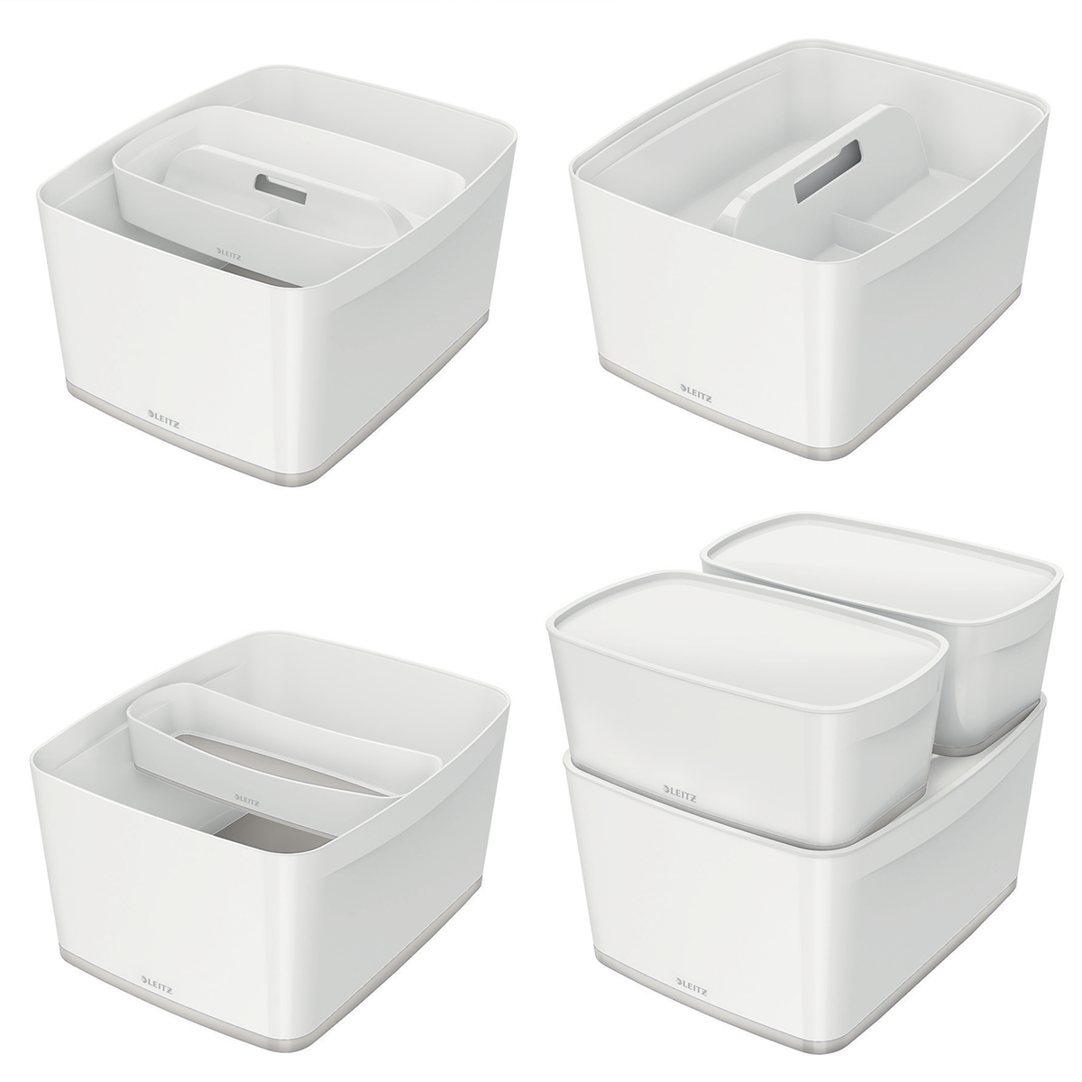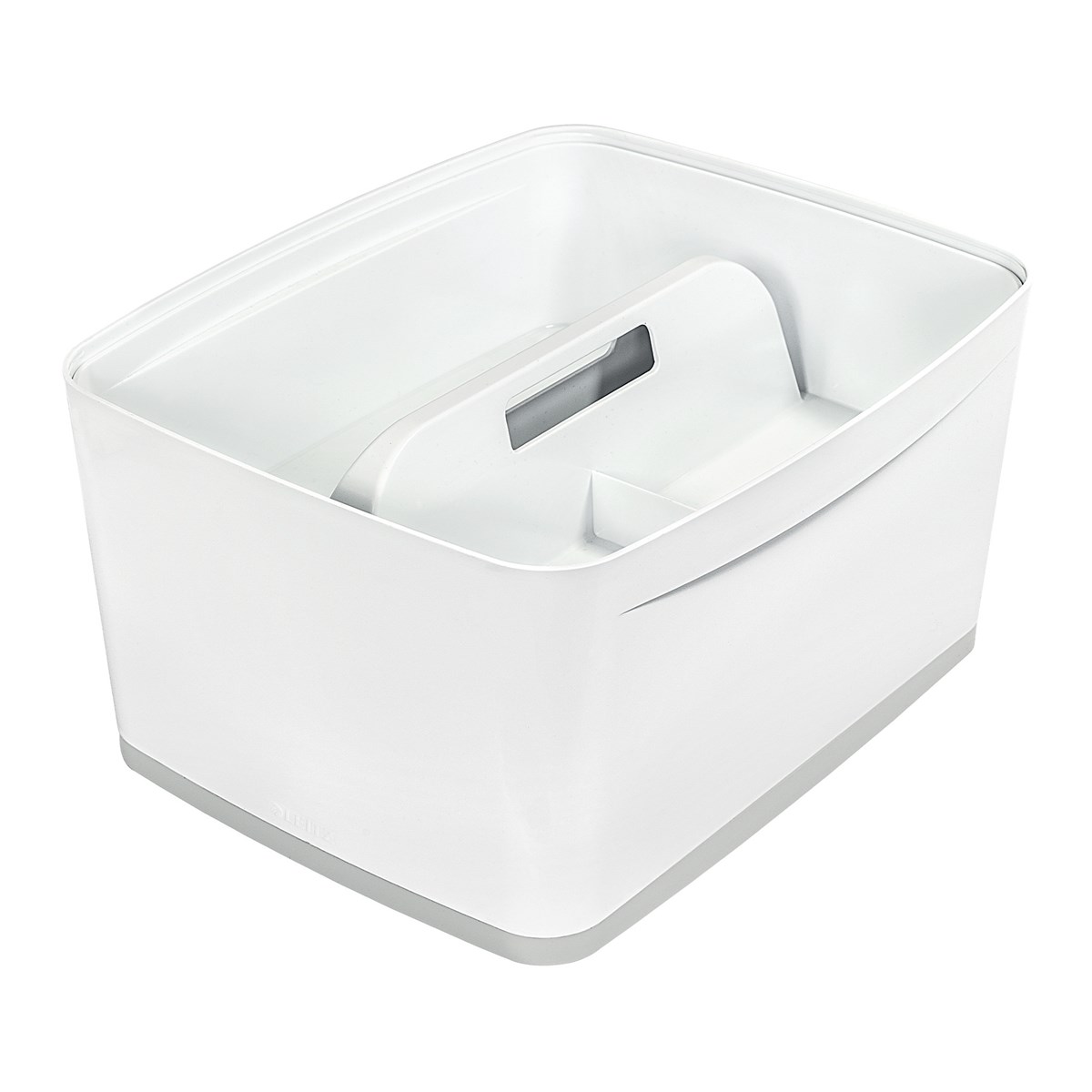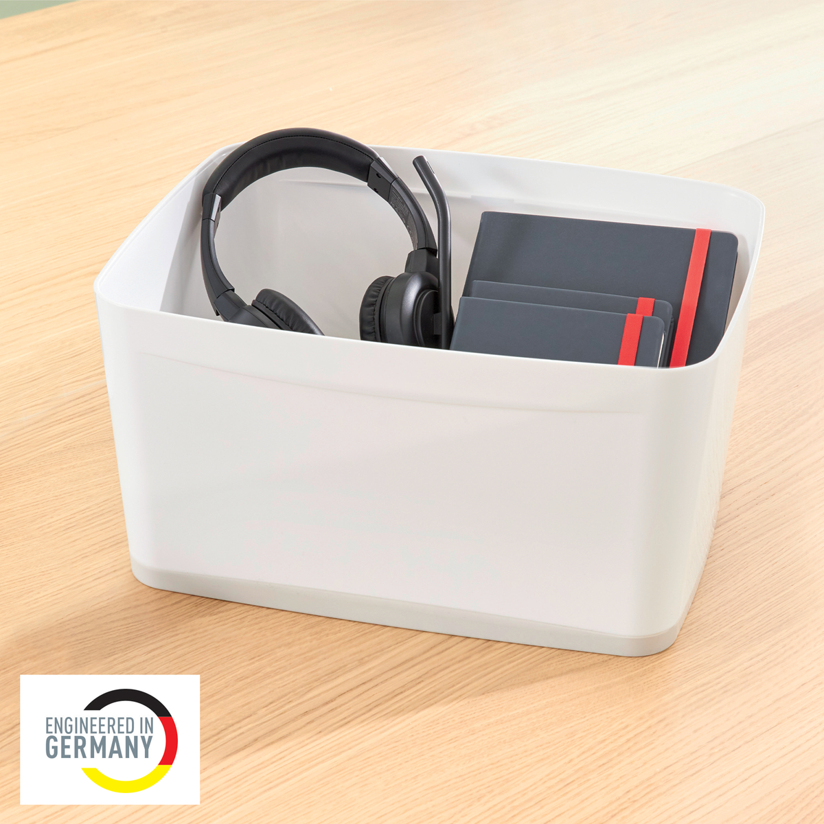 Snygg låda i två färger för snabb och enkel organisering och smart förvaring. 18 liter. Diskret snap-in-funktion gör den enkel att öppna och håller locket på plats. Tillverkad av robust, reptåligt och vattentätt plastmaterial för en förstklassig finish. Livsmedelssäker. Fri från BPA. Sparar utrymme: Leitz MyBox Large kan staplas med 2 x MyBox Small och får då plats på en standardhylla. När de inte använder kan lådorna staplas inuti varandra för att spara utrymme. Lätta att rengöra, med mjuka rundade hörn.