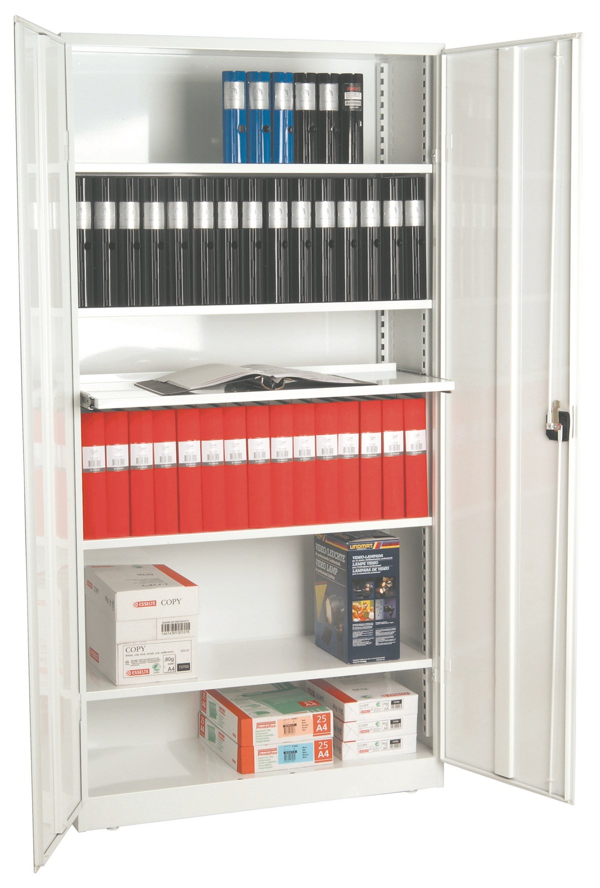 Skåp av svetsad stålplåt med försänkt lås och handtag. Levereras med 5 hyllplan varav 4 är flyttbara. Mått: B x H x D 1000 x 1970 x 425 mm. Miljöanpassad pulverlackering. 2 nycklar. 5 års funktionsgaranti. Frakt tillkommer, kontakta oss för prisuppgift.