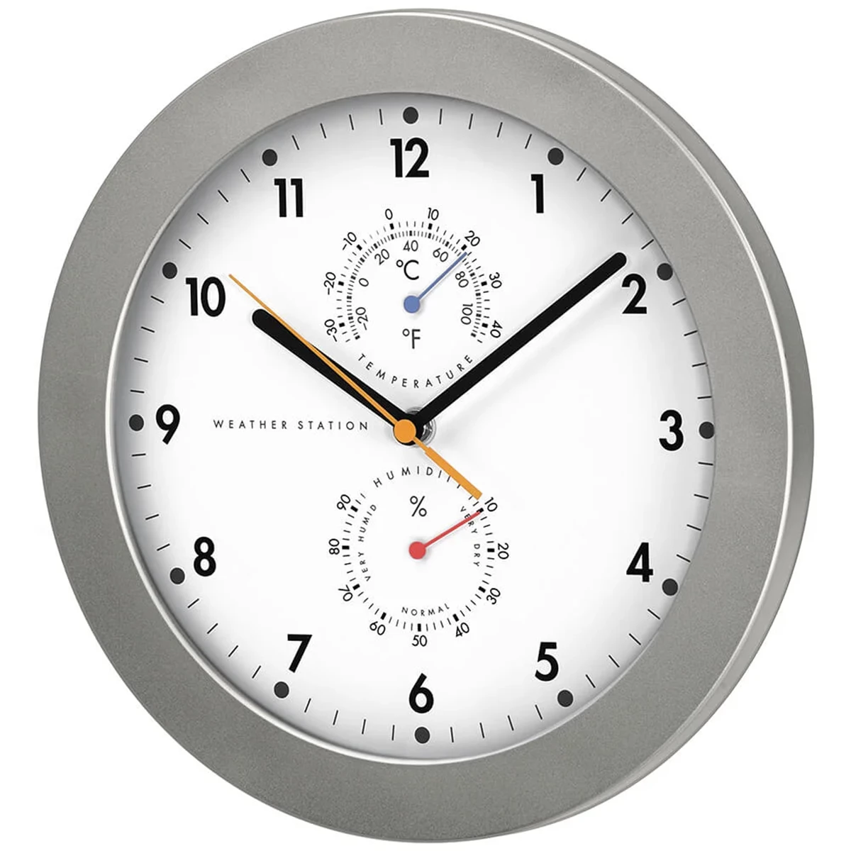 DCF radiokontrollerad klocka för montage på vägg. Den anger tid, temperatur och luftfuktighet på en analog display. 30 cm stor vit urtavla med svarta siffror. Timme, minut och sekundvisare. Drivs med 1 st AA-batteri (medföljer).