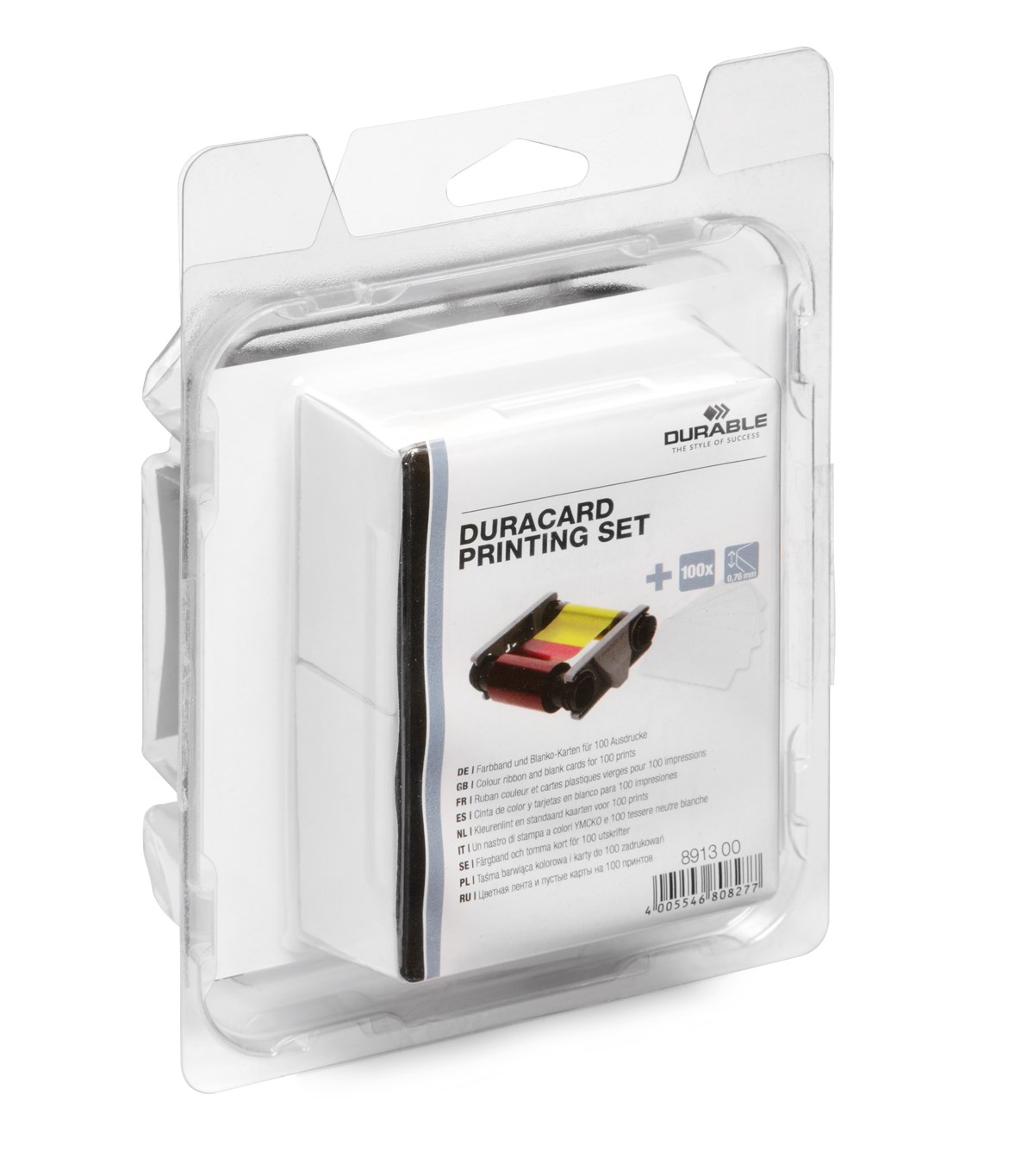 Set med 100 plastkort standard (0,76 mm) + YMCKO-färgband för utskrift i fotokvalitet i Duracard ID 300 plastkortskrivare. Det tunna transparenta skyddlagret ger trycket ett extra skydd.