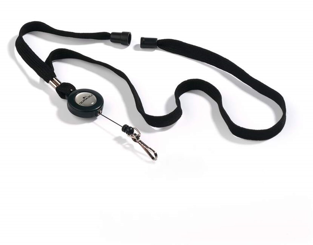 1 cm brett tubstickat nyckelband med utdragbart jojofäste med hake. Halsbandet har säkerhetslås som öppnas om man fastnar i något. Kan kombineras med t ex namnskyltar eller korthållare för passerkort. Längd halsband: 44 cm. Utdragbar längd jojon: max 80 cm.