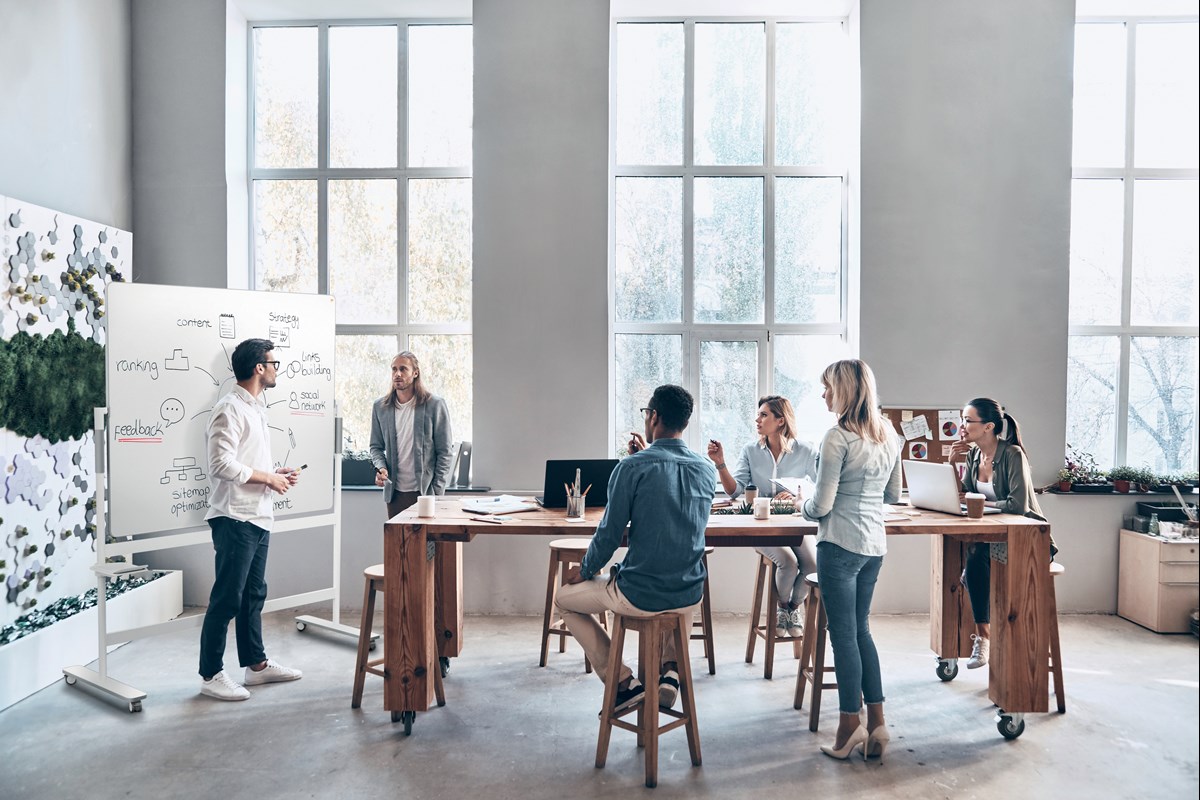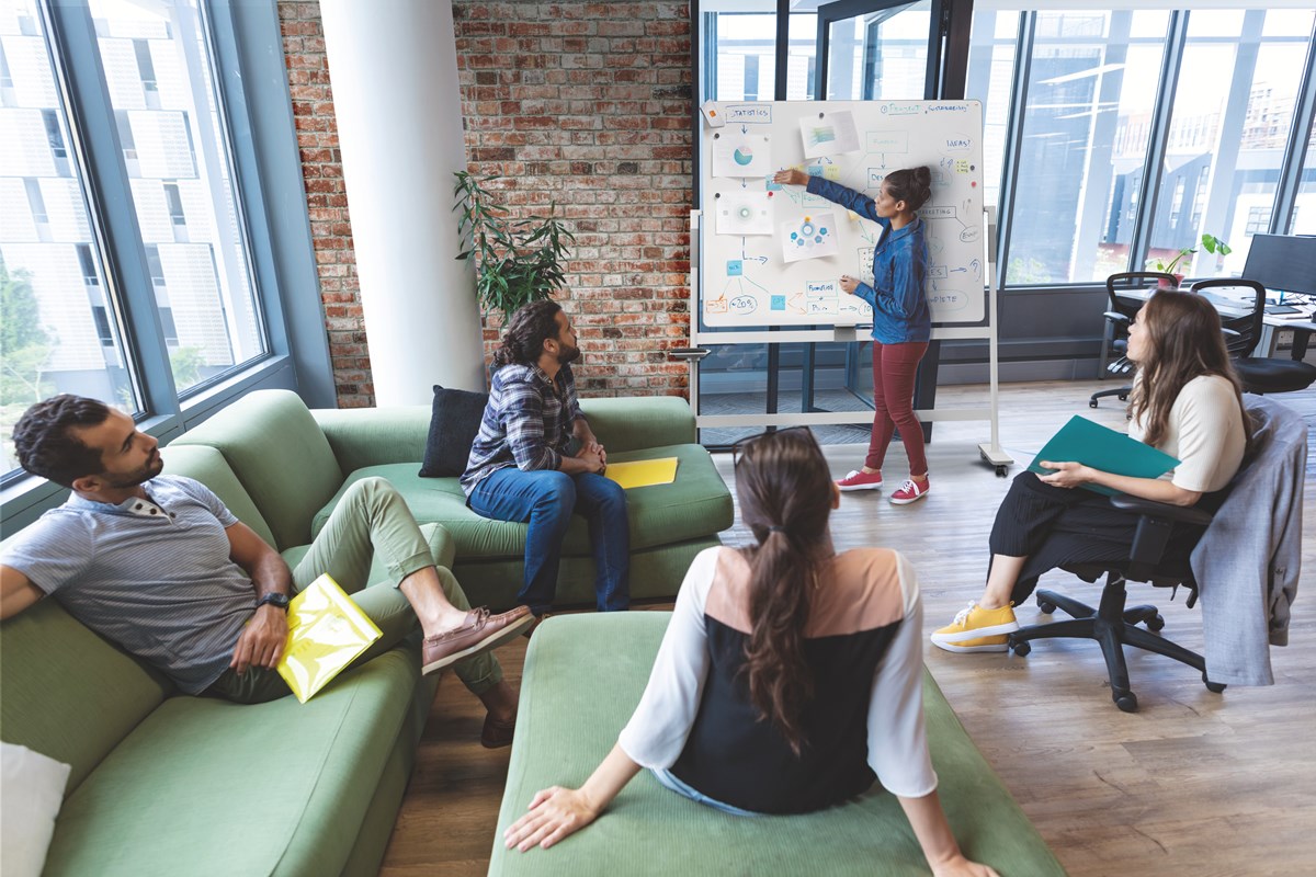 Den dubbelsidiga vridbara whiteboardtavlan från Move & Meet är det perfekta mobila samarbetsverktyget, lätt att flytta mellan olika platser.