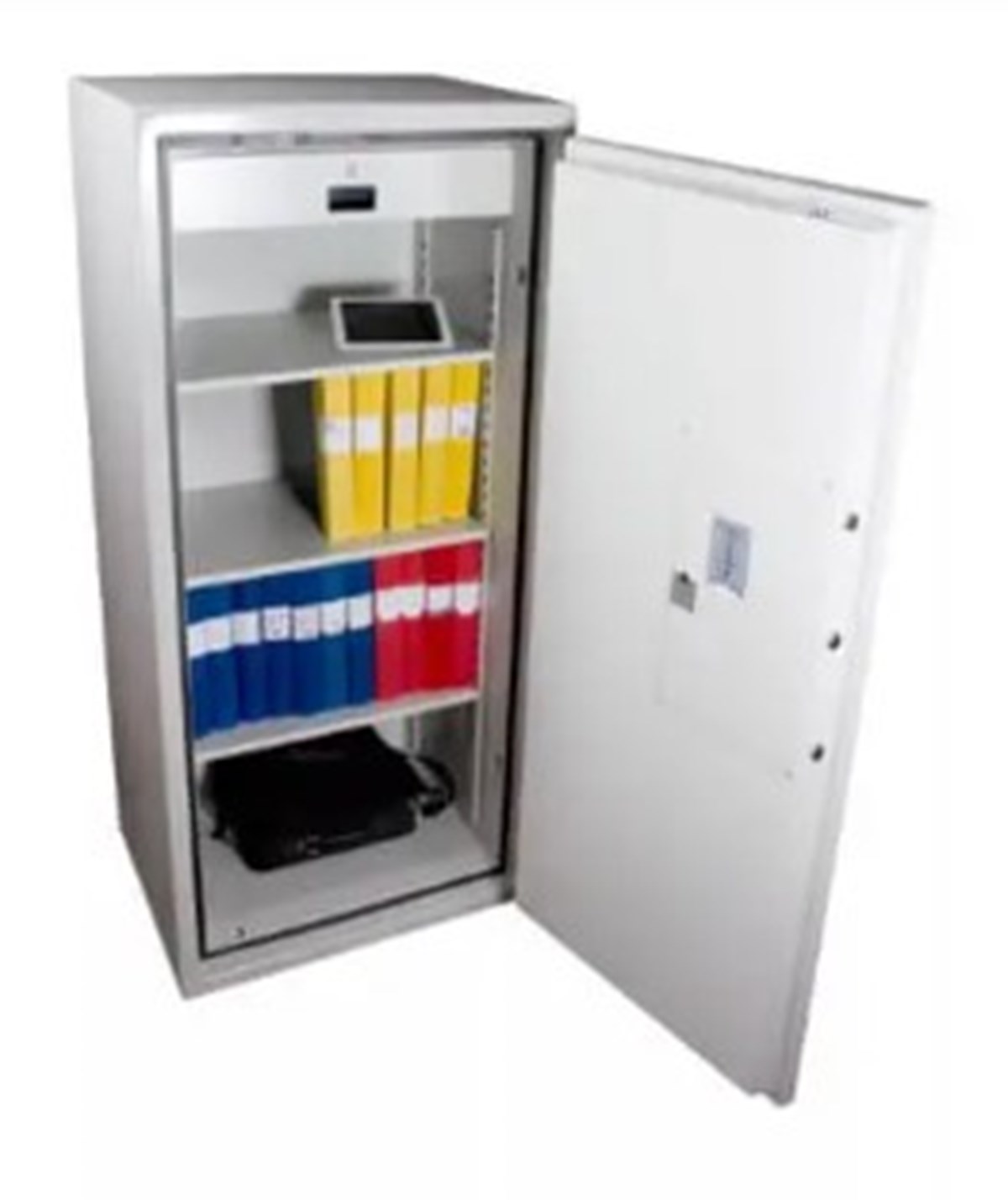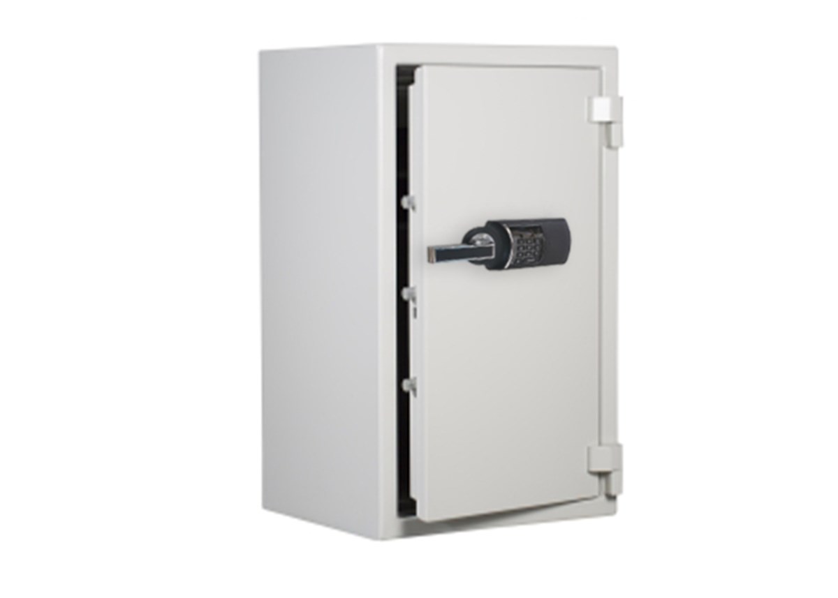 ES 350, 120P är brandsäkra dokumentskåp som skyddar papper vid brand. Skåpen är testade och godkända enligt NT Fire 017 i 120P papper. Skåpen är inredda med flyttbara hyllor för A4-pärmar samt en låsbar låda. Lådan kan lätt demonteras och då kan utrymmet nyttjas till pärmförvaring. Skåpen är som standard utrustade med elektroniskt kodlås med två utbytbara koder. Låset är borrskyddat med en sprängsäkring som låser regelverket vid inbrottsförsök. Brandklass: Brandsäkert i 120 min. Utv. mått mm: H: 1597 B: 737 D: 630 Inv. mått mm: H: 1438 B: 578 D: 463 Vikt 380kg