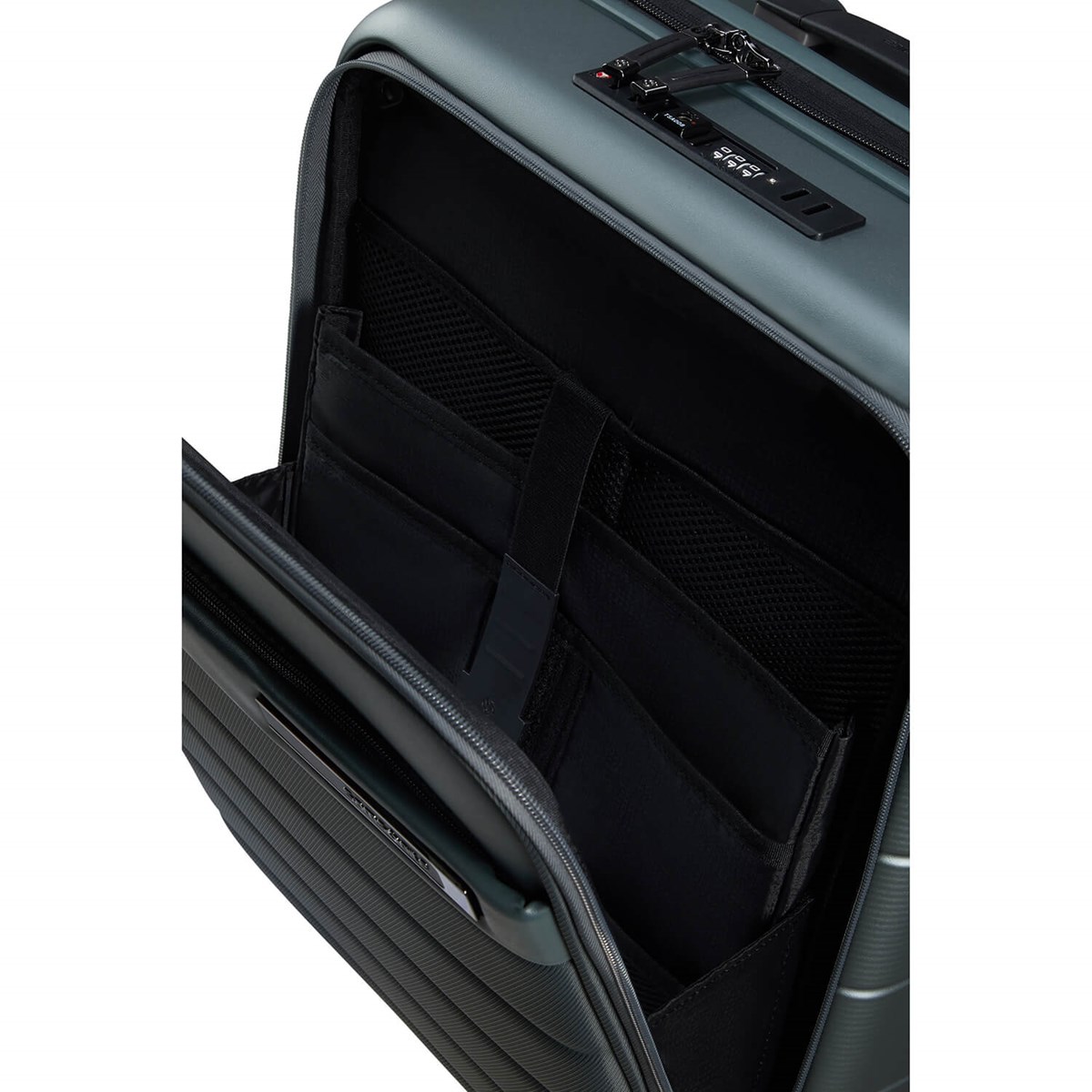 Funktioner Exteriör - Integrerad 3-siffrig TSA®* 008 - Högklassig säkerhet som gör att du kan stänga varje fack separat - Extra säkerhetsdragkedja (dubbel spole) - Draghandtag med dubbla rör som gör att du enkelt kan bära ett andra föremål med smart sleeve-funktion ovanpå din väska - Bärhandtag på toppen och sidan - Integrerad ID-bricka i draghandtagets grepp