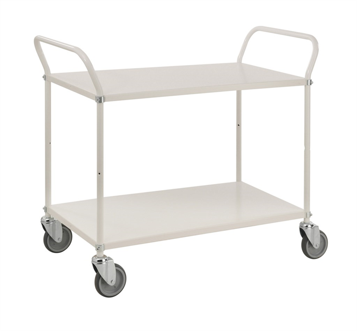 Plåtvagn i 2 plan. Hyllplanen kan monteras med kant upp eller ner efter eget önskemål. Rejäla 125 mm hjul vilket gör den lätt att köra. Klarar belastning upp till 250 kg. Höjd till översta hyllplan 760 mm. Avstånd mellan hyllplan 530 mm. Hyllplan 900 x 540 mm. Mått: 1070 x 585 x 940 mm. Levereras omonterad.