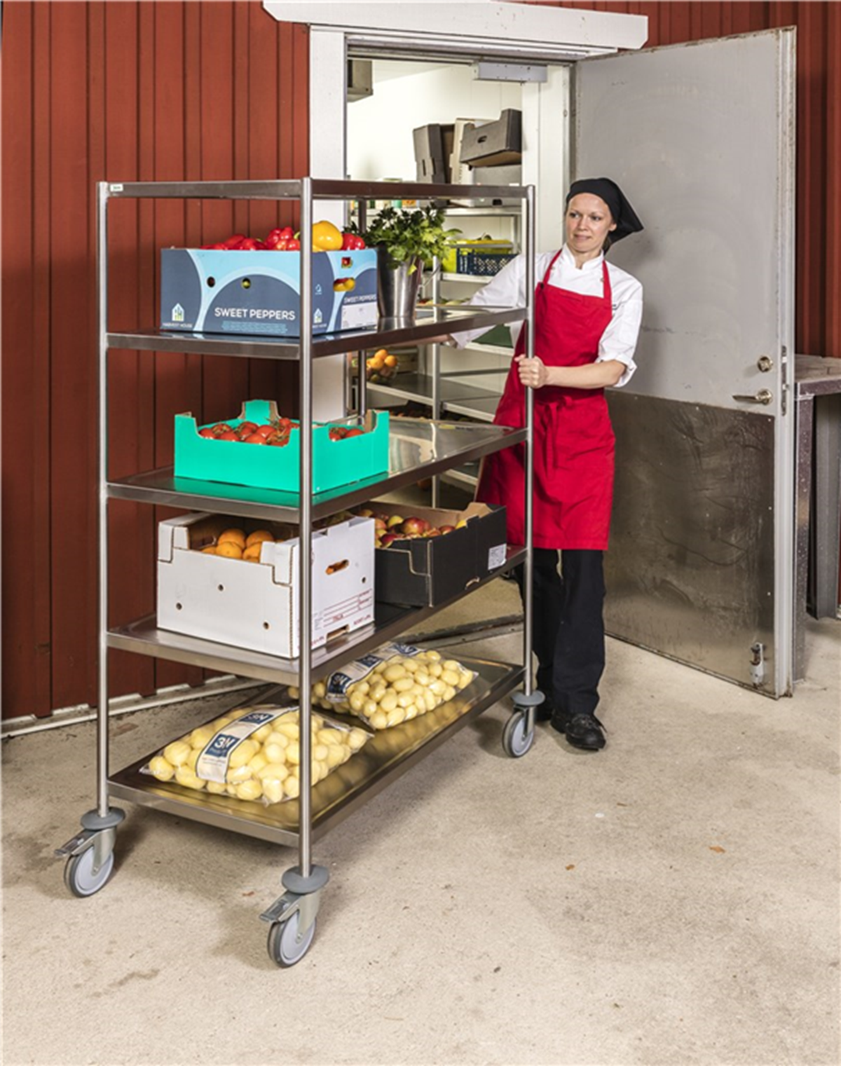 Hög helsvetsad vagn i 5 plan utan handtag. Vagnen är anpassad för att användas till bl.a. livsmedelshantering och kök där det ställs tuffa krav. Fyra hjul varav två med broms. Mått: 1075 x 575 x 1650 mm. Belastning: upp till 200 kg.