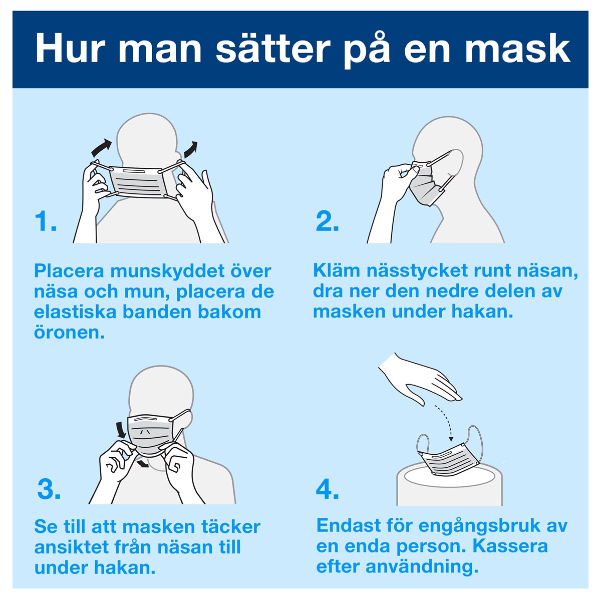 3-lagers blått munskydd som minskar risken för smittspridning och uppfyller EN 14683 standard (stänkskydd för 16kPa). Kan användas i miljöer där det finns risk för skvättande vätskor. CE-märkta. Fria från latex. Elastiska öronband. 50 st/förp.