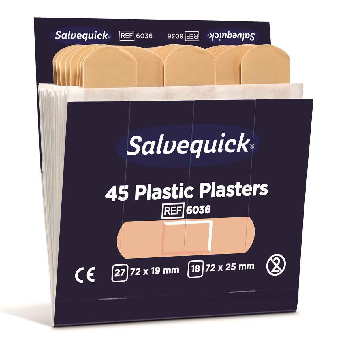Salvequick Plastplåster är smidiga plåster av hög kvalitet. Plåstren är allergitestade. De är lätta att applicera, flexibla och smidiga att använda. Varje refill innehåller 45 plåster (27 st 72x19 mm och 18 st 72x25 mm). 6 refiller/förp.