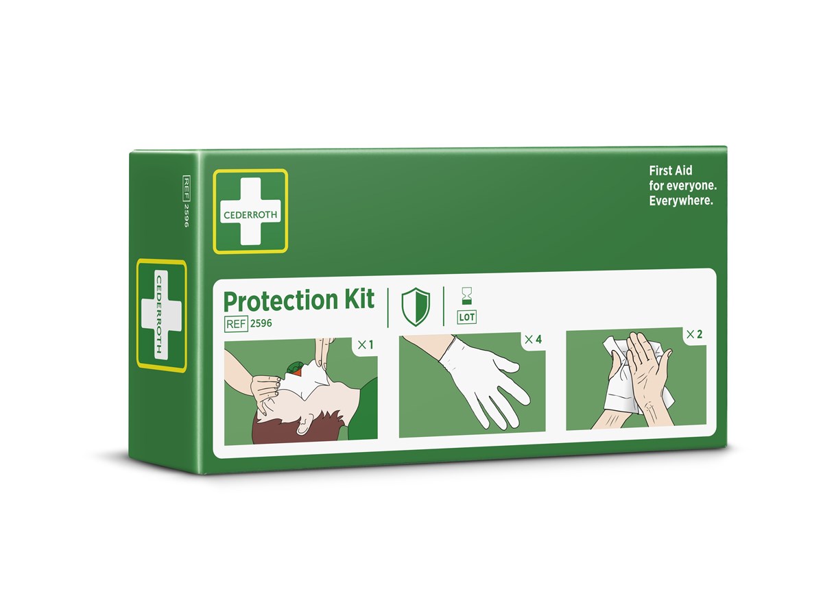Cederroth Skyddspaket innehåller andningsmask, handskar och sårtvättare. Andningsmasken är ett hjälpmedel för att ge mun-till-mun-andning på rätt sätt samtidigt som det minskar risken för kontakt mellan hjälpare och skadad. Cederroths andningsmask är försedd med backventil. På skyddsduken finns tydliga instruktioner i färg.