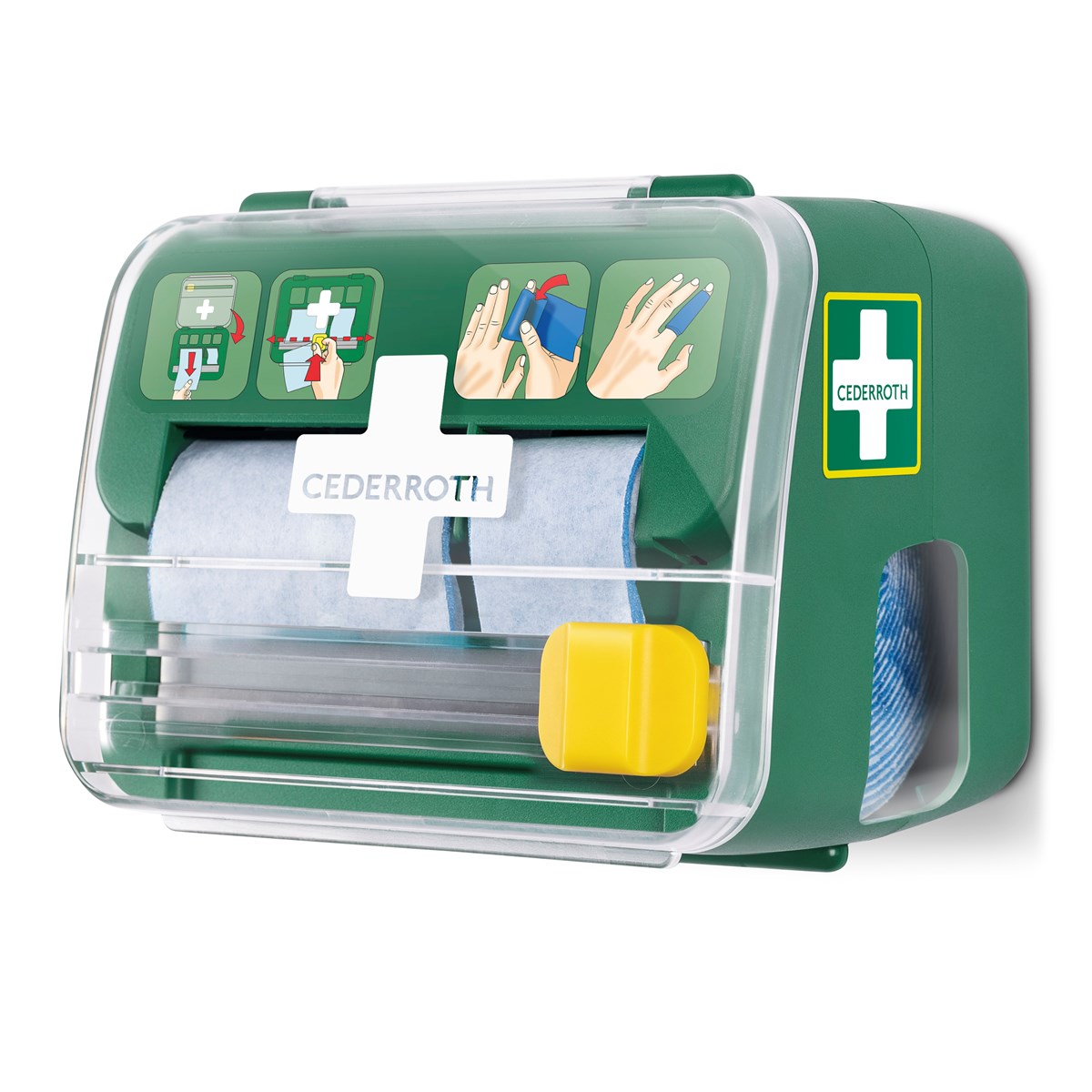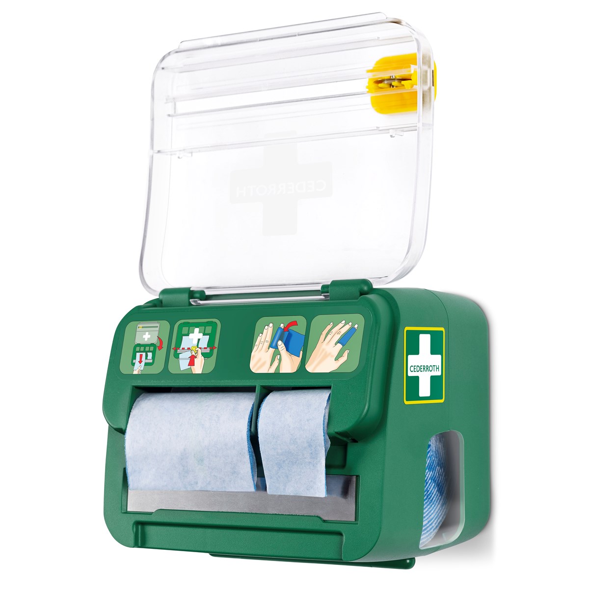 Dispensern har en integrerad skärkniv för enkel användning med tydliga instruktioner. Kompakt storlek som gör den enkel att montera på väggen, även på små ytor. Dispensern är låst för att förhindra svinn, och öppnas enkelt med refillnyckel. En transparent lucka skyddar produkterna mot damm och smuts.