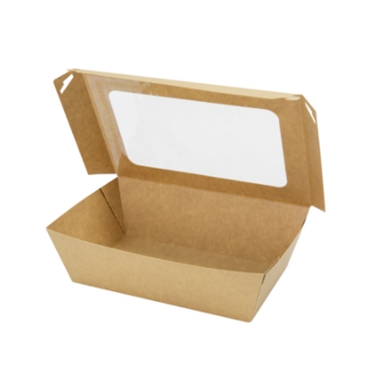 Brun salladsbox med fönster. Mått: 165x100x58 mm.