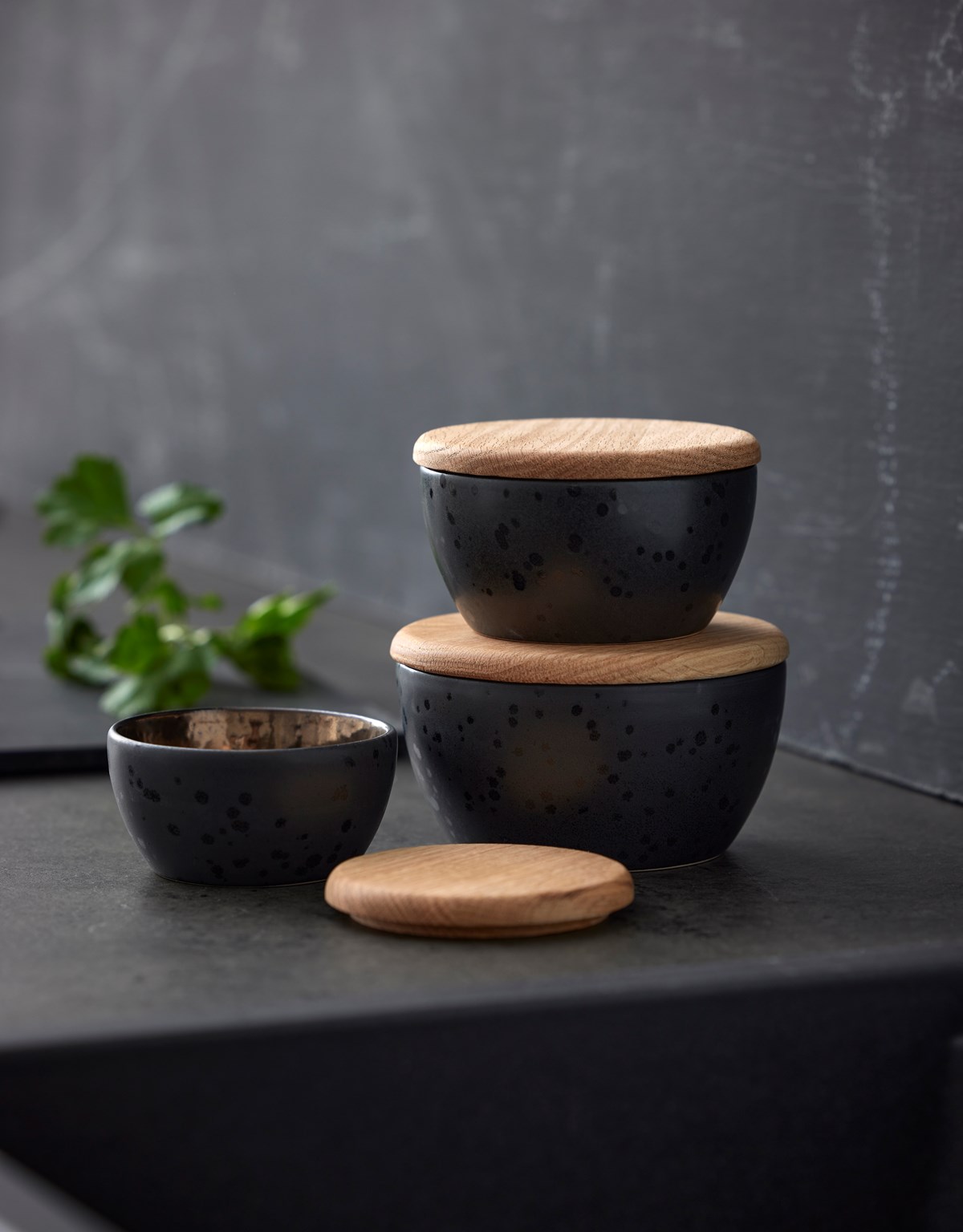 Skålar i stengods med mattglaserad utsida och vacker, blank bronsglasyr på insidan. Lock av ek. 3 skålar i storlekarna 10, 12 och 14 centimeter.