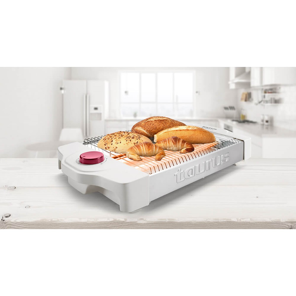 Njut av den stora rostytan på Neptuno Plus platta brödrost från Taurus. Du kan rosta alla typer av bröd och bakverk, praktiskt och enkelt, på några minuter. Dess tre 900W kvartsvärmeelement garanterar supersnabb, jämn rostning. Tack vare dess 12 inställningar kan du ställa in rostningsgrad efter eget tycke. Neptuno Plus flat brödrost är riktigt bekväm och lätt att använda. Den stora rostytan på 24x20 cm gör att du inte bara kan rosta olika typer och brödtjocklekar, den är också perfekt för bakverk och smörgåsar. Den är extremt lätt att använda, lägg helt enkelt en croissant, en skiva bröd eller smörgås ovanpå och rosta till önskad krispighet och brunhet. För att hålla brödrosten ren har Neptuno Plus en uttagbar smulbricka som fångar upp smulor som produceras under rostningen. Dess lätt borttagbara brickan gör rengöringen enklare och förhindrar att smulor brinner vid senare användning. Den har ett sladdfack för enkel förvaring.