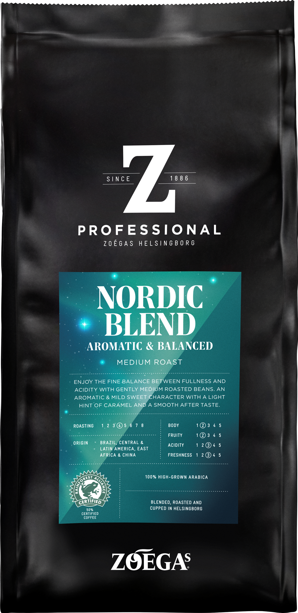 Det finns en ny stjärna i norr - Zoégas Professional Nordic Blend är ett aromatiskt mellanrostat bryggkaffe med balanserad fyllighet och syra. Njut av en kopp som bjuder på en mild söt karaktär med lätta toner av karamell och en len eftersmak. Gjort på varsamt rostade Arabicabönor från bland annat Brasilien, Central- och Latinamerika, Östafrika och Kina.