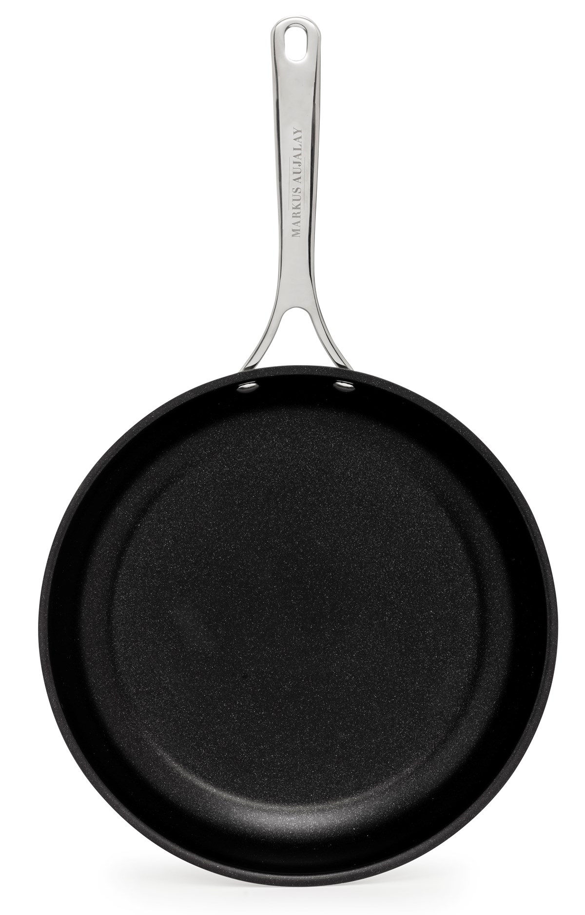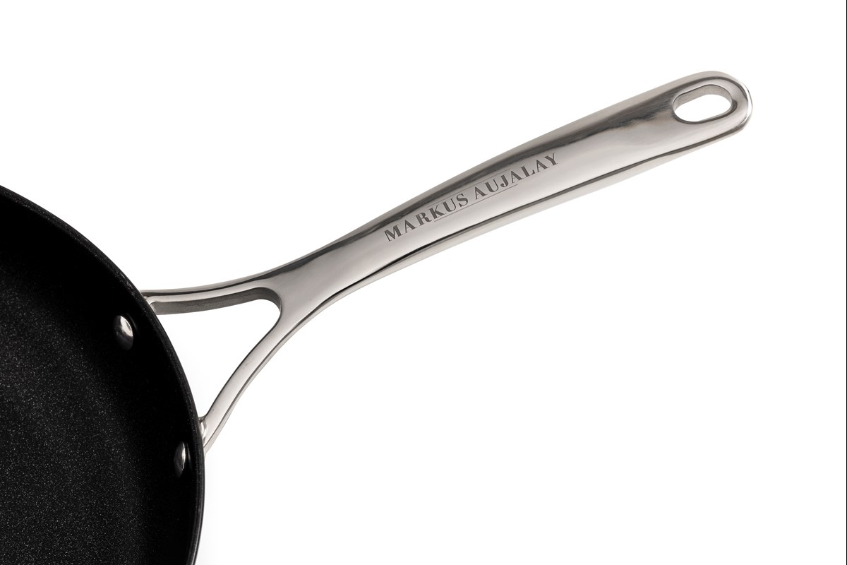 En 28 cm stor stekpanna av allra högsta kvalitet med ergonomiskt handtag. Kvalitet 18/10 rostfritt stål 0,7 mm med 4,5 mm aluminiumisolering och 0,5 mm 430 stål i botten vilket ger bästa värme. Behandlad med quantanium 3 lager premium nonstick. Passar alla spisar inklusive induktionshäll.
