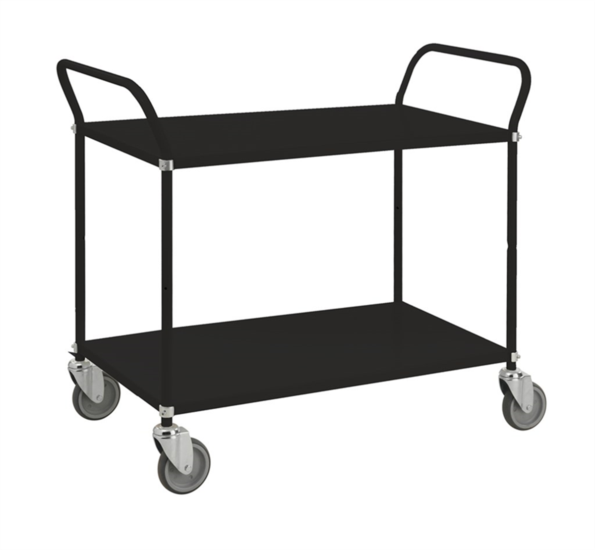 Plåtvagn i 2 plan. Hyllplanen kan monteras med kant upp eller ner efter eget önskemål. Rejäla 125 mm hjul vilket gör den lätt att köra. Klarar belastning upp till 250 kg. Höjd till översta hyllplan 760 mm. Avstånd mellan hyllplan 530 mm. Hyllplan 900 x 440 mm. Mått: 1080 x 480 x 940 mm. Levereras omonterad.