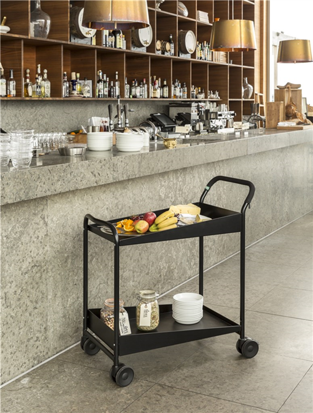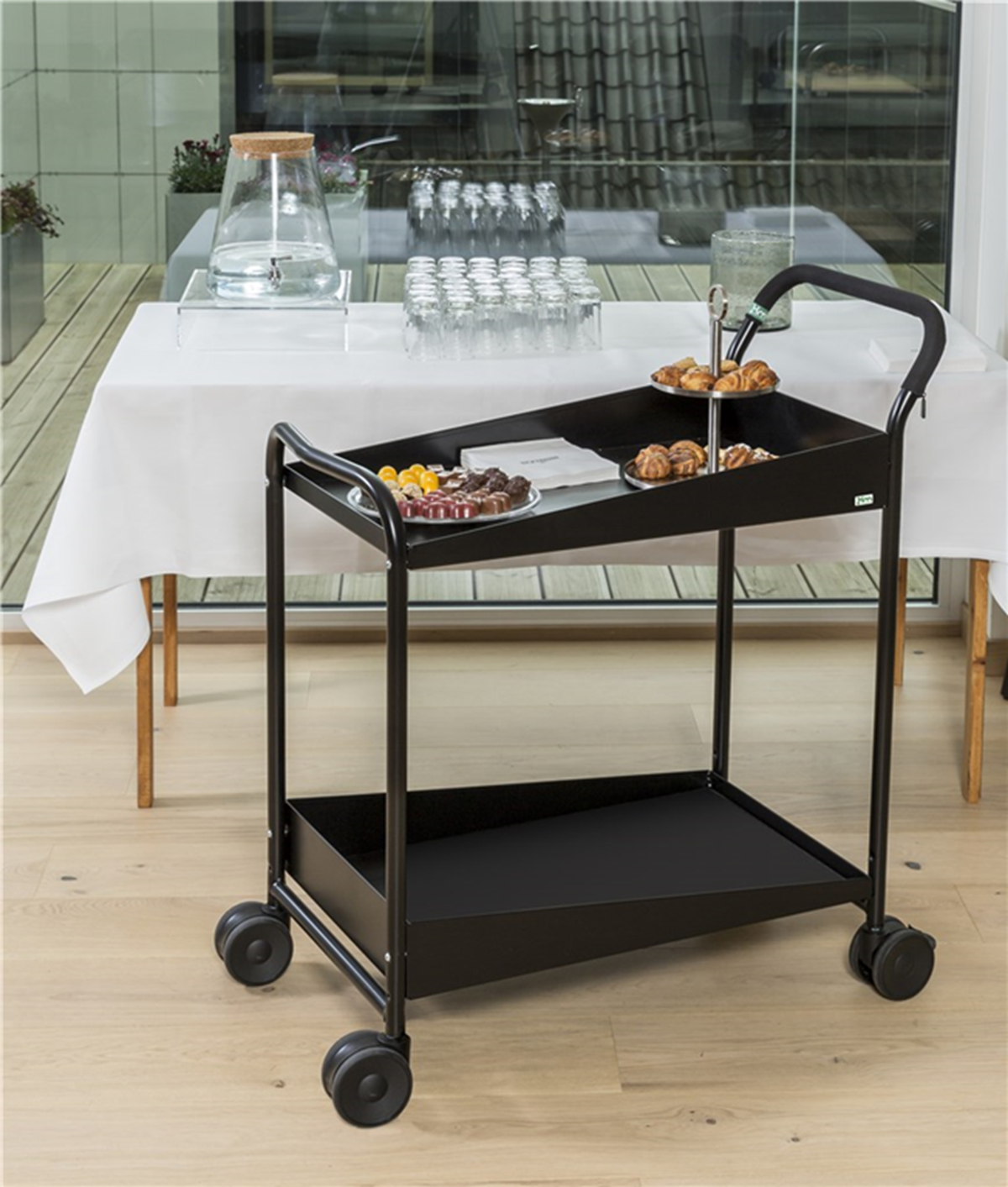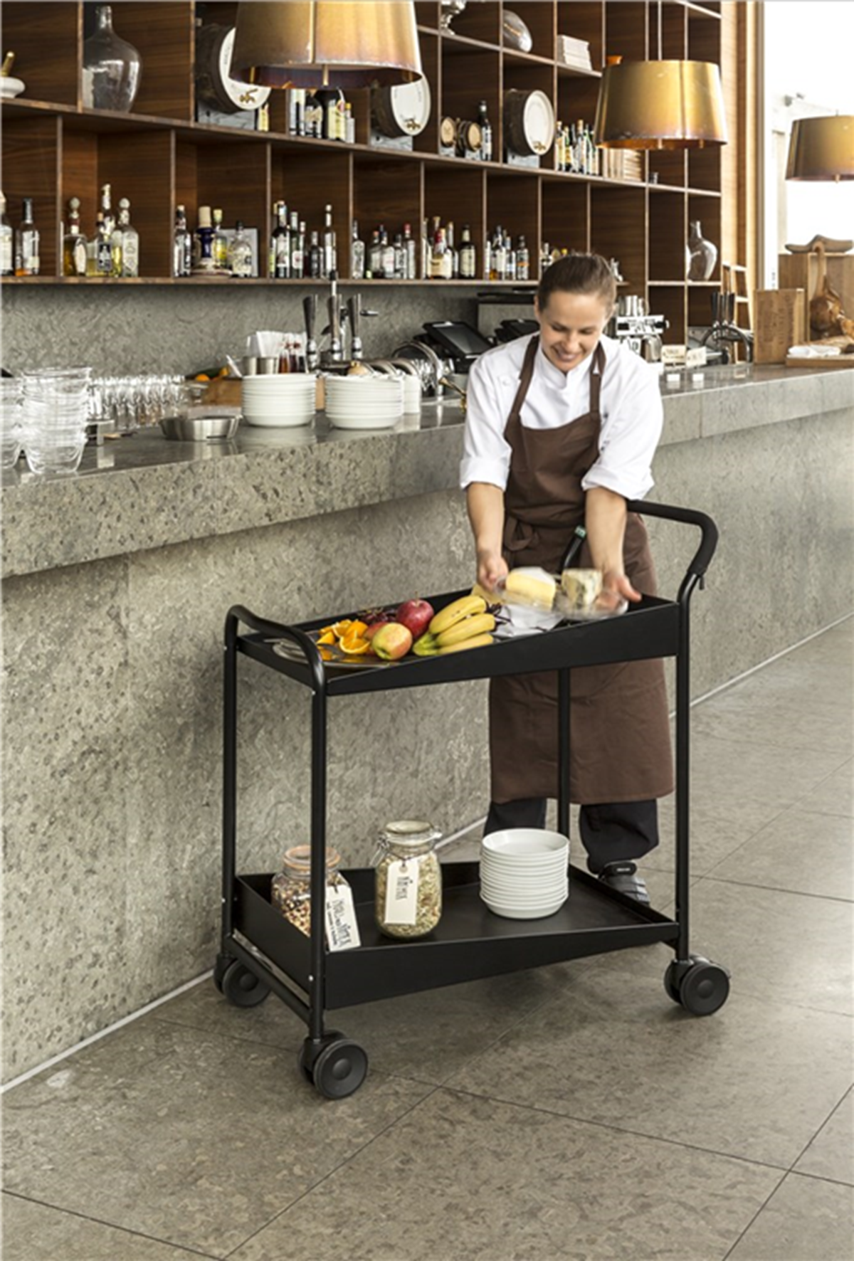 Vagn i 2 plan. Svart mönstrad gummimatta på hyllplan och kullagrade dubbelhjul som gör vagnen elegant till utseendet och mycket lätt att köra. Handtag med ergonomic softgrip. Avstånd mellan hyllplan 560 mm. Höjd till översta hyllplan 710 mm. Hyllkant 31 - 105 mm. 4 länkhjul, 2 med broms 100 mm. Belastning 150 kg. Levereras omonterad.