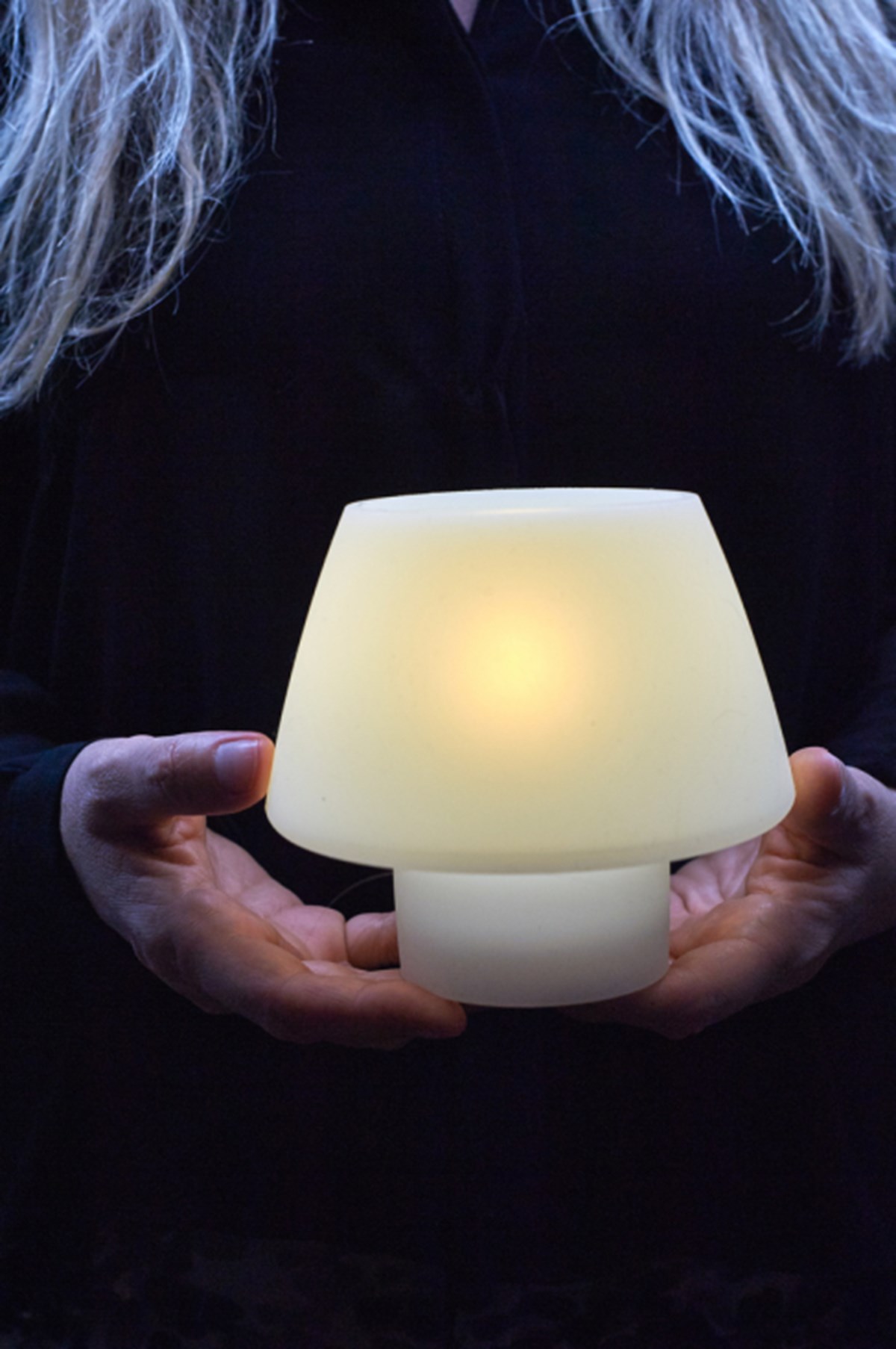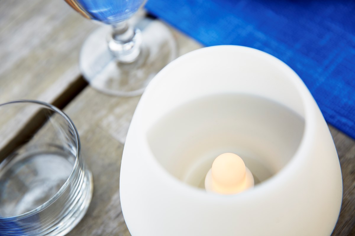 Skapar ett varmt ljus och bidrar till en stämningsfull miljö både inomhus och utomhus. Tillverkad av vit silikon. Mått: 123 x Ø129 mm.