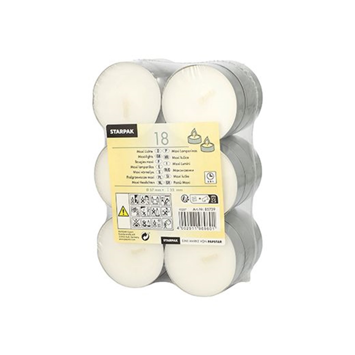 Extra stora värmeljus. Diameter 57 mm, höjd 22 mm. Ca 8 timmars brinntid. 18 st/förp.