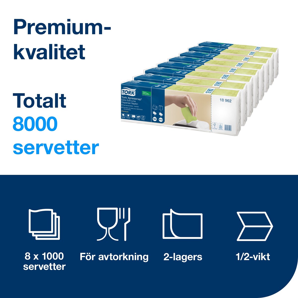 Hektiska miljöer med självservice behöver en balans mellan bekvämlighet och kvalitet – den tjocka 2-lagerskonstruktionen hos Tork Xpressnap® Extra Mjuk Dispenserservett ger dig båda två. Beställning och lagerhantering förenklas av att servetterna kan användas med alla Tork Xpressnap® Dispensrar. Det kostnadseffektiva systemet har arkvis utmatning och minskar förbrukningen med 25 % jämfört med traditionella dispensrar. Det förbättrar också hygienen då gästerna bara rör det de tar.
