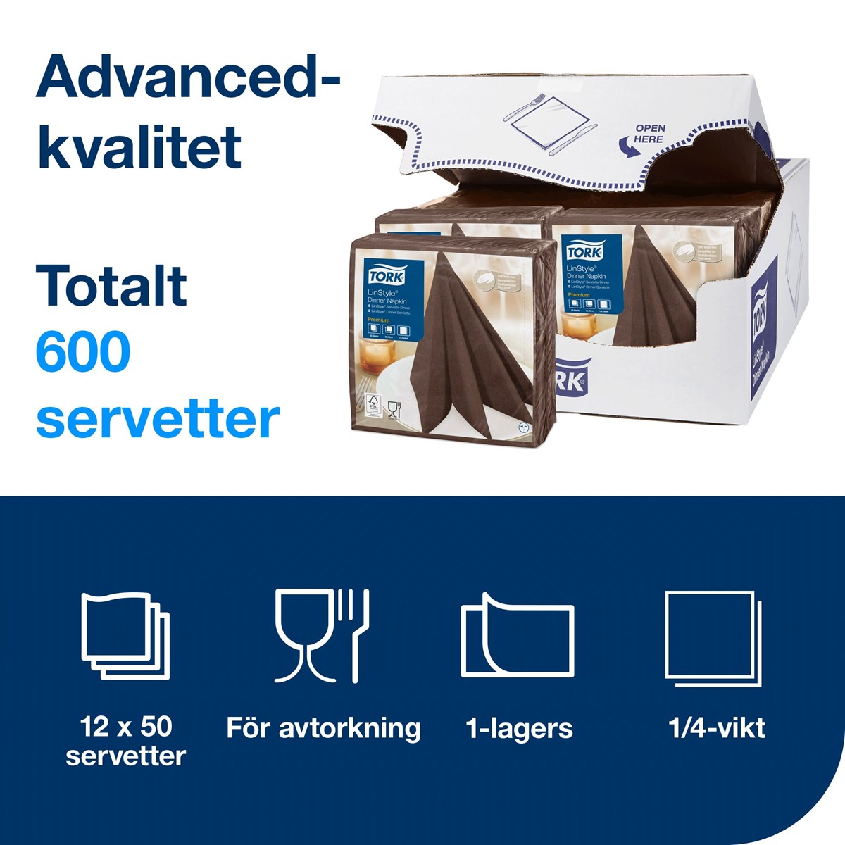 Gör ett fantastiskt första intryck i fullbetjäningsrestauranger med högkvalitativa LinStyle® Middagsservett. Med sin känsla av linne är den mjukare och tjockare än vanliga pappersservetter och ger ett elegant intryck. Suverän hållbarhet gör att restaurangservetterna varar under hela middagen, vilket minskar kostnader och förbrukning. Samtidigt ser den höga absorptionsförmågan till att personal enkelt kan städa upp spill. Med engångsservetter slipper personalen också tvättbesvären som kommer med textilservetter. 1-lagers. Premium-kvalitet. Mått vikt: 19,5x19,5 cm. Mått ovikt: 39x39 cm.