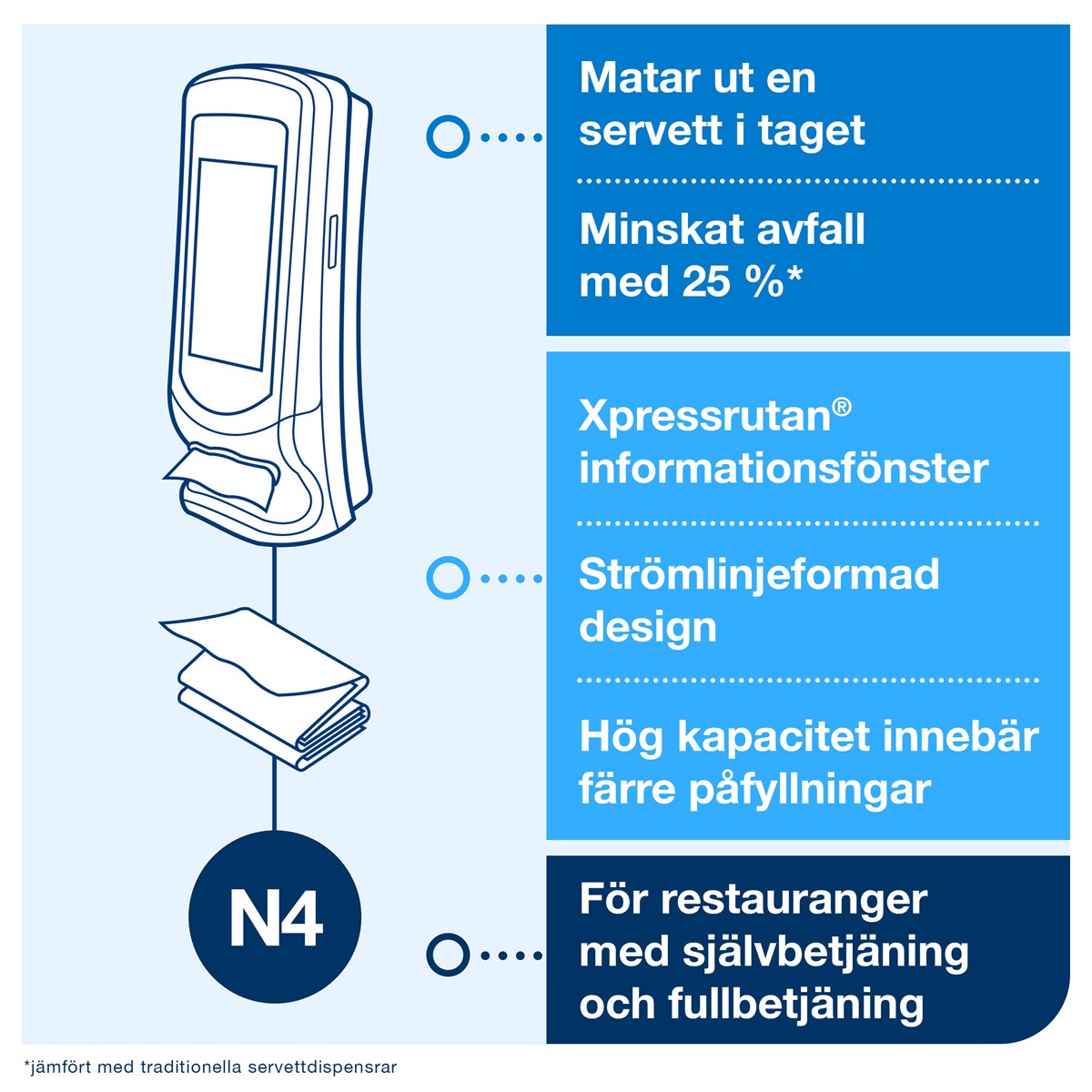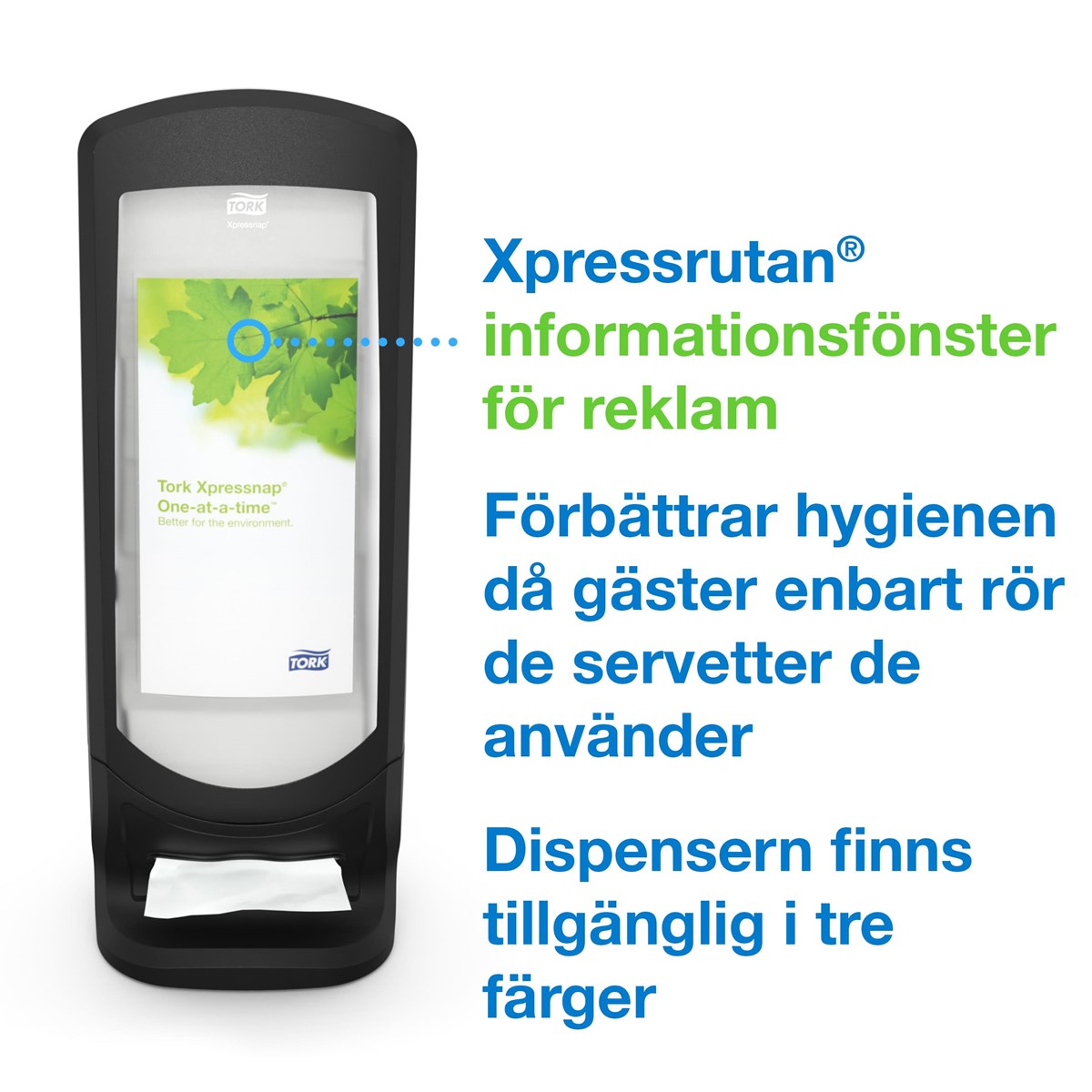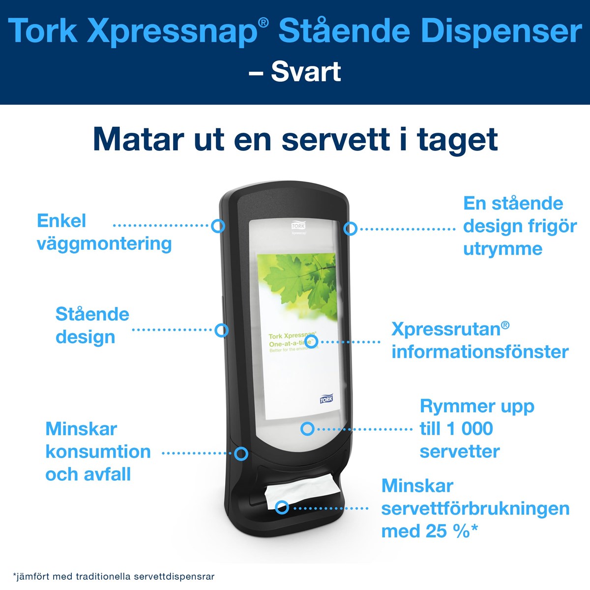 Stående servettdispenser som också kan hängas på väggen. Placera eget budskap i reklamrutan. Hög kapacitet – rymmer 1100 N4-servetter. Format: H62,2 x B23,5 x D23,5 cm.
