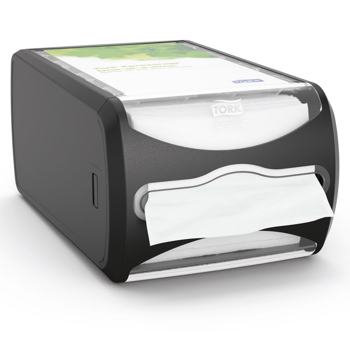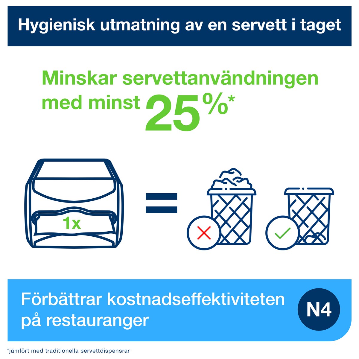 Liggande servettdispenser som kan staplas ovanpå varandra. Placera eget budskap i reklamrutan. Rymmer 550 st N4-servetter. Format: H14,5 x B19,1 x D30,5 cm.