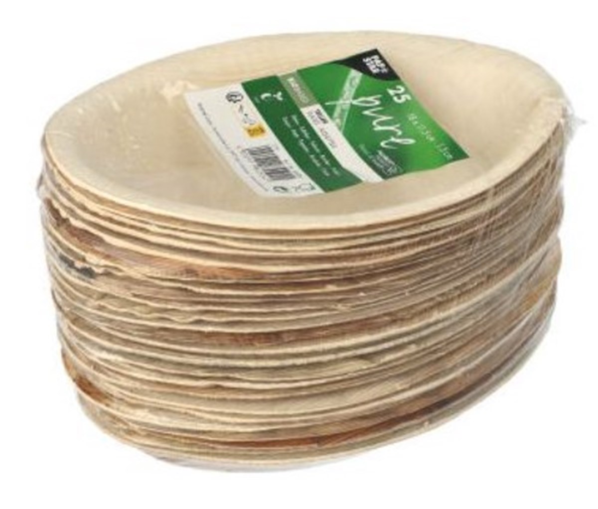 Tallrik tillverkad av fallna palmblad från den indiska Betel palmen. När palmbladen fallit till marken så samlas de in, tvättas och torkas under solen. Sedan pressas de till önskad form och storlek i en unik värmeprocess.