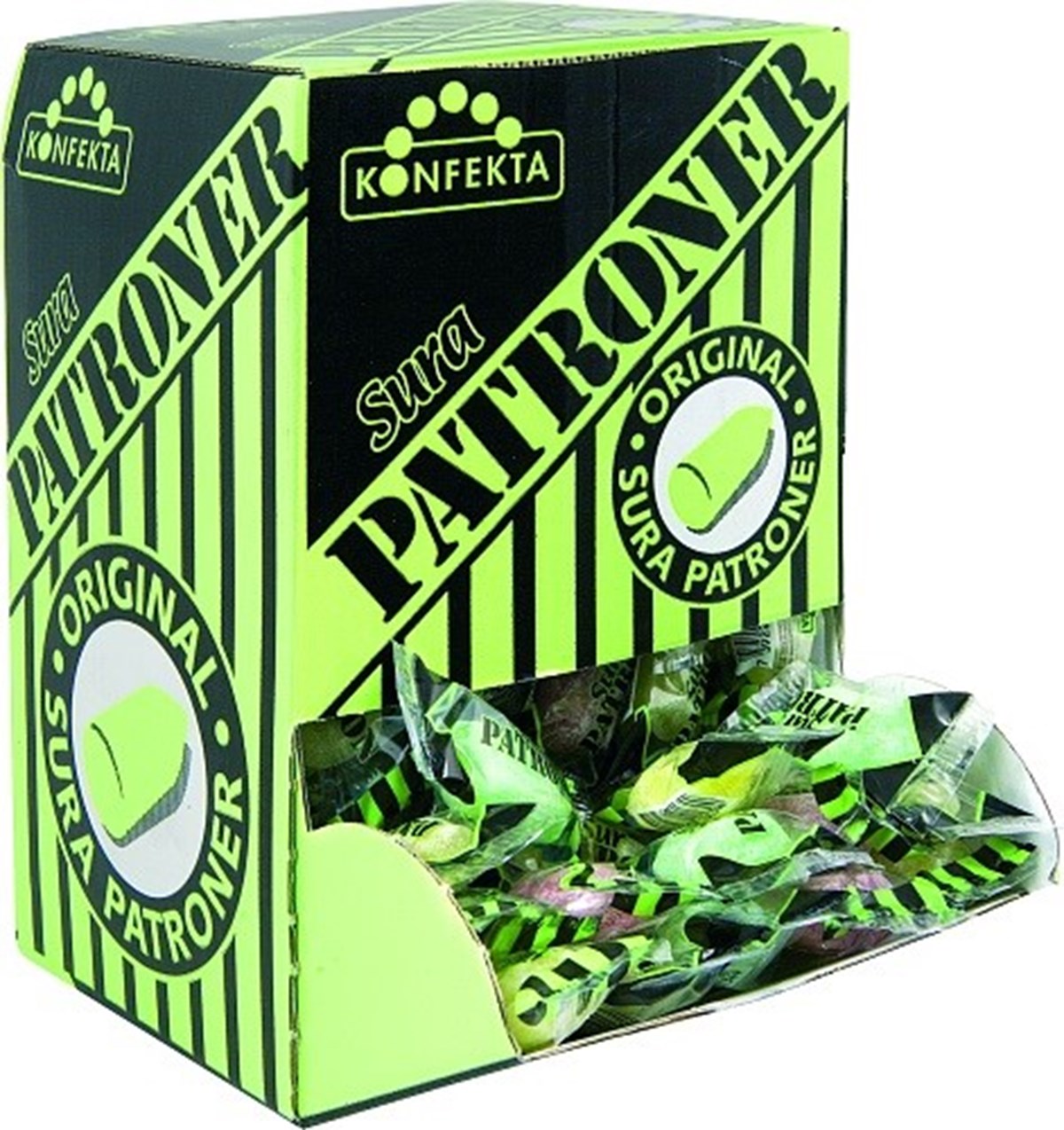 Sura Patroner från Konfekta är en patronformad och otroligt god och syrlig karamell som gör det svårt att bara ta en! De sura patronerna kommer i tre olika färger och är smidigt portionsförpackade, hårda, sura och oemotståndligt goda. Godiset har nu funnits i ca 30 år vilket gör det till ett riktigt nostalgiskt retro godis. Tack vare att de sura patronerna är portionsförpackade kan kunderna enkelt köpa med sig en eller flera och förvara i sin jackficka utan klet. Perfekt att sälja i butik, kiosk, förening m.m.