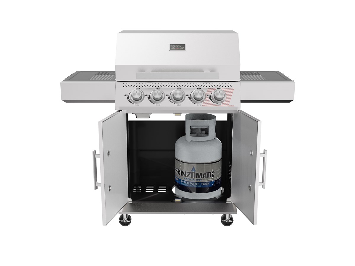 Z50 erbjuder två praktiska sidobord som ger gott om utrymme för både förberedelser och servering. Under grillen finns ett smart förvaringsutrymme för gasolflaskan och tillbehör. En av sidorna är utrustad med en knivhållare, medan den andra sidan har tre krokar för grillverktyg. För extra smidighet har grillen fyra hjul, vilket gör det lätt att flytta den vid behov.