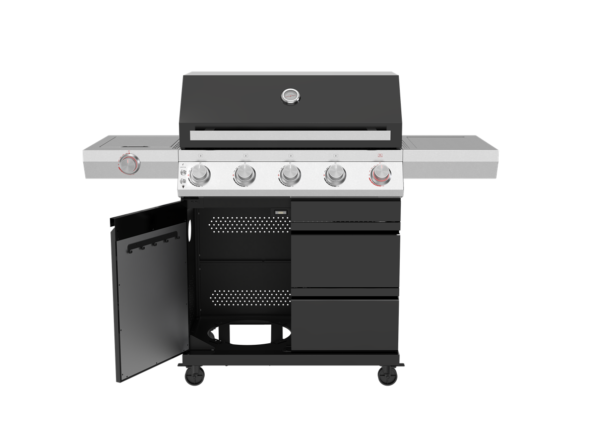 Specifikationer: - Grillyta: 81,5 x 44 cm - Antal huvudbrännare: 5 (varav en sizzle burner) - Effekt per huvudbrännare: 3,5 kW (sizzle burner: 4 kW) - Material, huvudbrännare: Rostfritt stål - 1 sizzle burner i vänster sidobord - Effekt, sizzle burner (sidobord): 3,5 kW - Material, sizzle burner (sidobord): Keramik - Total effekt: 21,5 kW - Material, flamtämjare: Extra kraftigt 430 rostfritt stål - Tändningssystem: Elektrisk tändning - Gastryck: 30 mbar - Antal grillgaller: 2 - Material, grillgaller: 304 rostfritt stål - Material, värmehylla: 304 rostfritt stål - Material, grill: Rostfritt stål, lackerat stål, emaljerat stål - Arbetshöjd: 90 cm - B x D x H: 152,5 x 64 (71) x 117 cm - Produktvikt: 67 kg - Uttag för rotisserie: Ja - Gängad gasolanslutning för enkel och säker anslutning - Rekommenderad gasolflaska: PC5 eller PC10