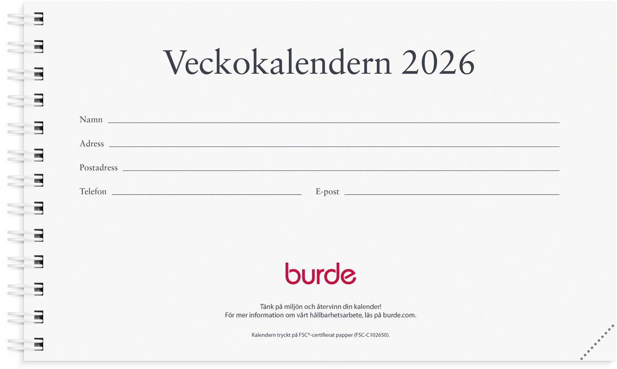 Format: 148x90 mm. Layout: Stående. Vecka/uppslag. Timindelning 8-17. Kalendarium: 2025-12-15 - 2027-01-03. Omslag: Kartong. Spiralbunden. Innehåll: Kyrkliga helgdagar, Flaggdagar, Helgdagar/aftnar, Månfaser, Namnsdagar, Internationella helgdagar översikt, Temadagar/händelser, Årsöversikt/årsöversikter, Årsplan/årsplaner. Antal sidor: 128. Miljöinformation: FSC®.