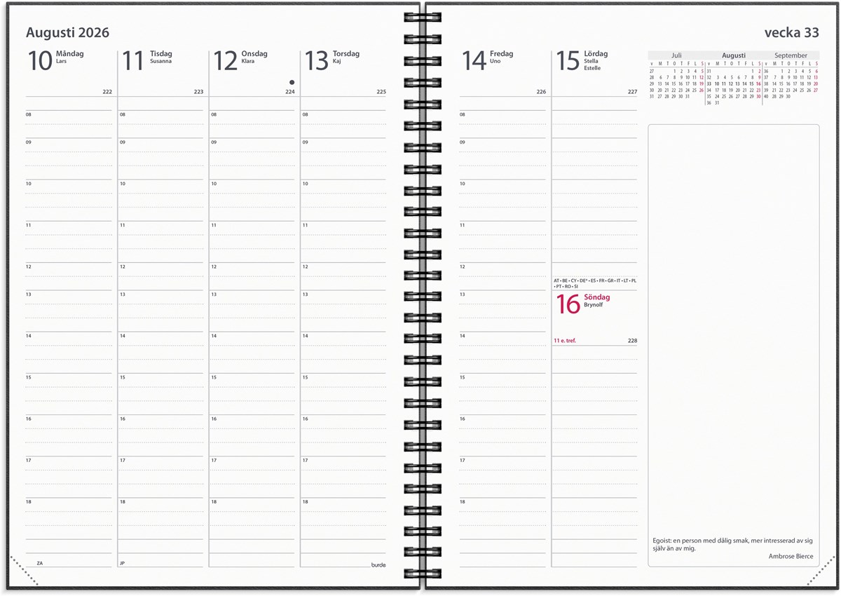 Format: A5. Layout: Stående. Vecka/uppslag. Timindelning 8-18. Kalendarium: 2025-11-24 - 2027-01-03. Omslag: Konstläder. Spiralbunden. Innehåll: Kyrkliga helgdagar, Flaggdagar, Helgdagar/aftnar, Internationella helgdagar, Månfaser, Namnsdagar, Internationella helgdagar översikt, Temadagar/händelser, Årsöversikt/årsöversikter, Årsplan/årsplaner. Antal sidor: 144. Miljöinformation: FSC®.