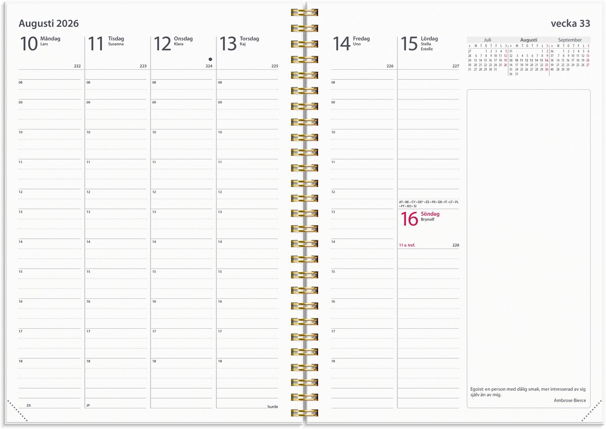 Format: A5. Layout: Stående. Vecka/uppslag. Timindelning 8-18. Kalendarium: 2025-11-24 - 2027-01-03. Omslag: Kartong. Spiralbunden. Detaljer: Gummiband. Pappersficka. Innehåll: Kyrkliga helgdagar, Flaggdagar, Helgdagar/aftnar, Internationella helgdagar, Månfaser, Namnsdagar, Internationella helgdagar översikt, Temadagar/händelser, Årsöversikt/årsöversikter, Årsplan/årsplaner. Antal sidor: 128. Miljöinformation: FSC®.