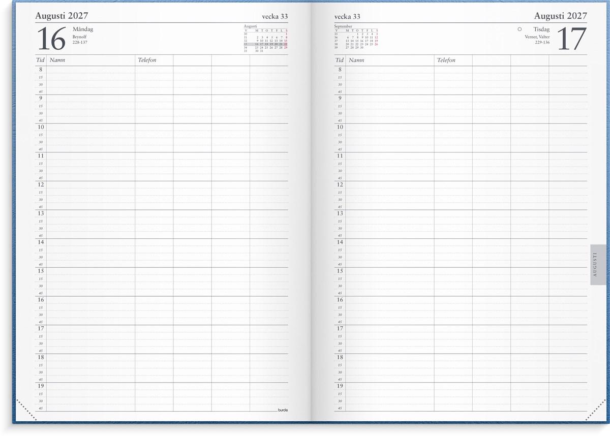 Format: 180x265 mm. Layout: Dag/sida. Kvartsindelning 8-20. Kalendarium: 2027-01-01 - 2027-12-31. Omslag: Kartong. Inbunden. Detaljer: Märkband. Innehåll: 5 kolumner, Flaggdagar, Helgdagar/aftnar, Månfaser, Namnsdagar, Temadagar/händelser, Årsöversikt/årsöversikter, Årsplan/årsplaner. Antal sidor: 368. Miljöinformation: FSC®.