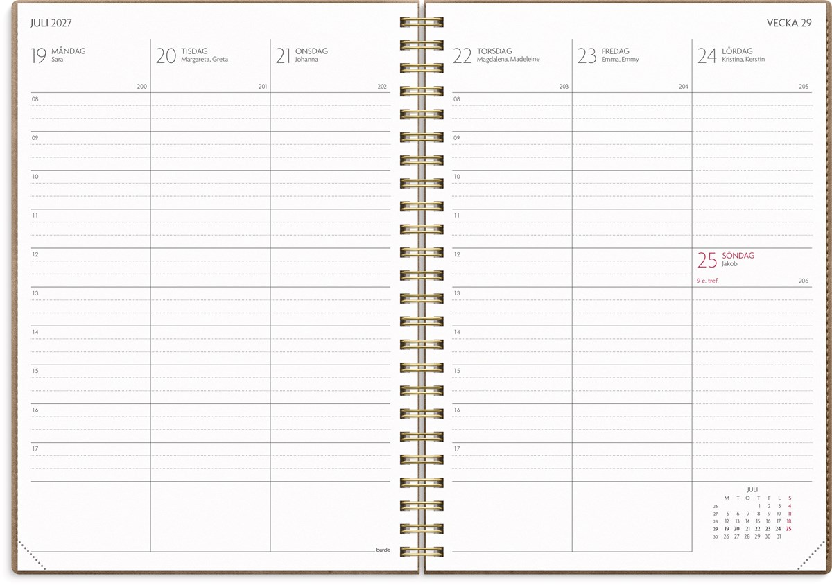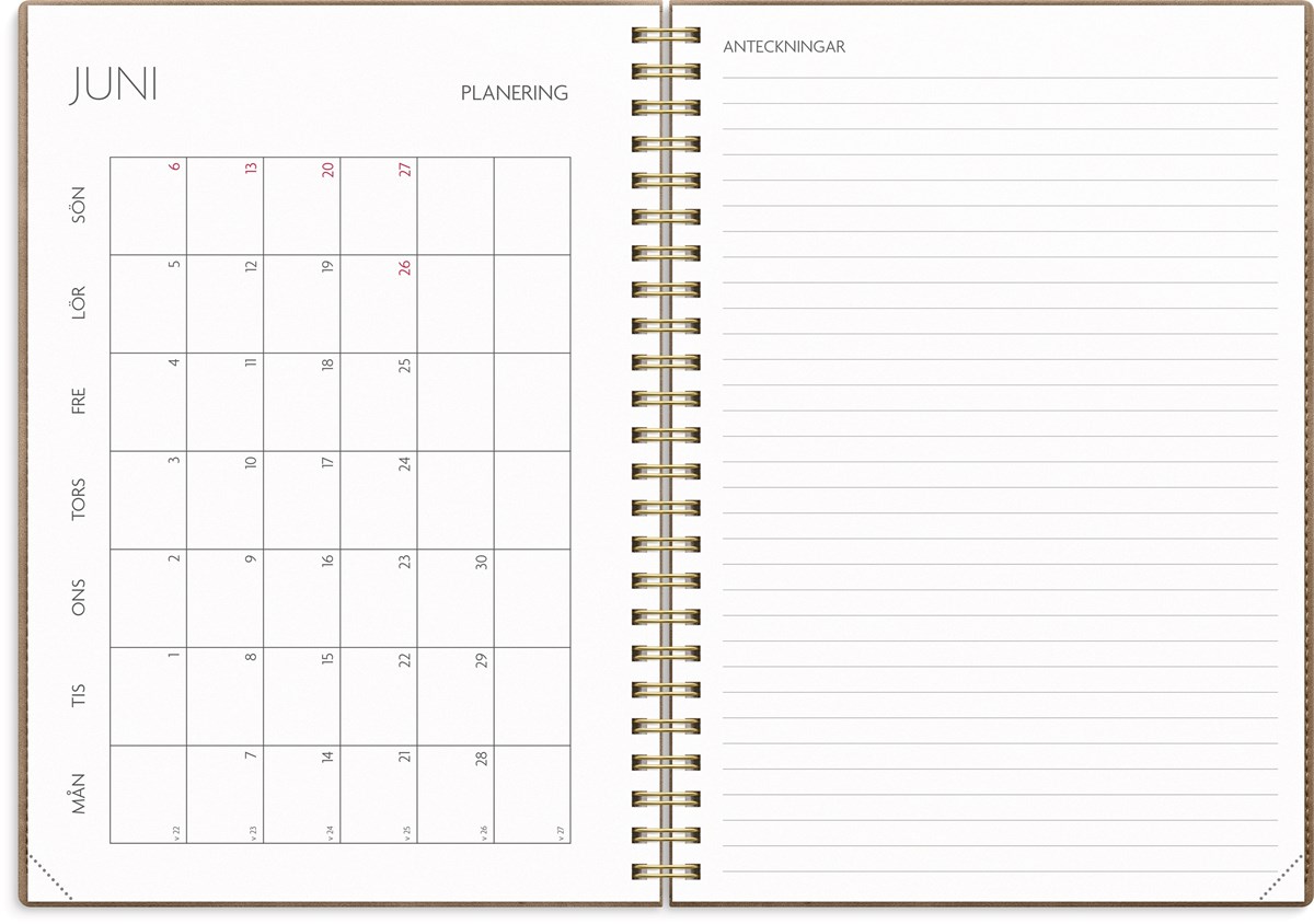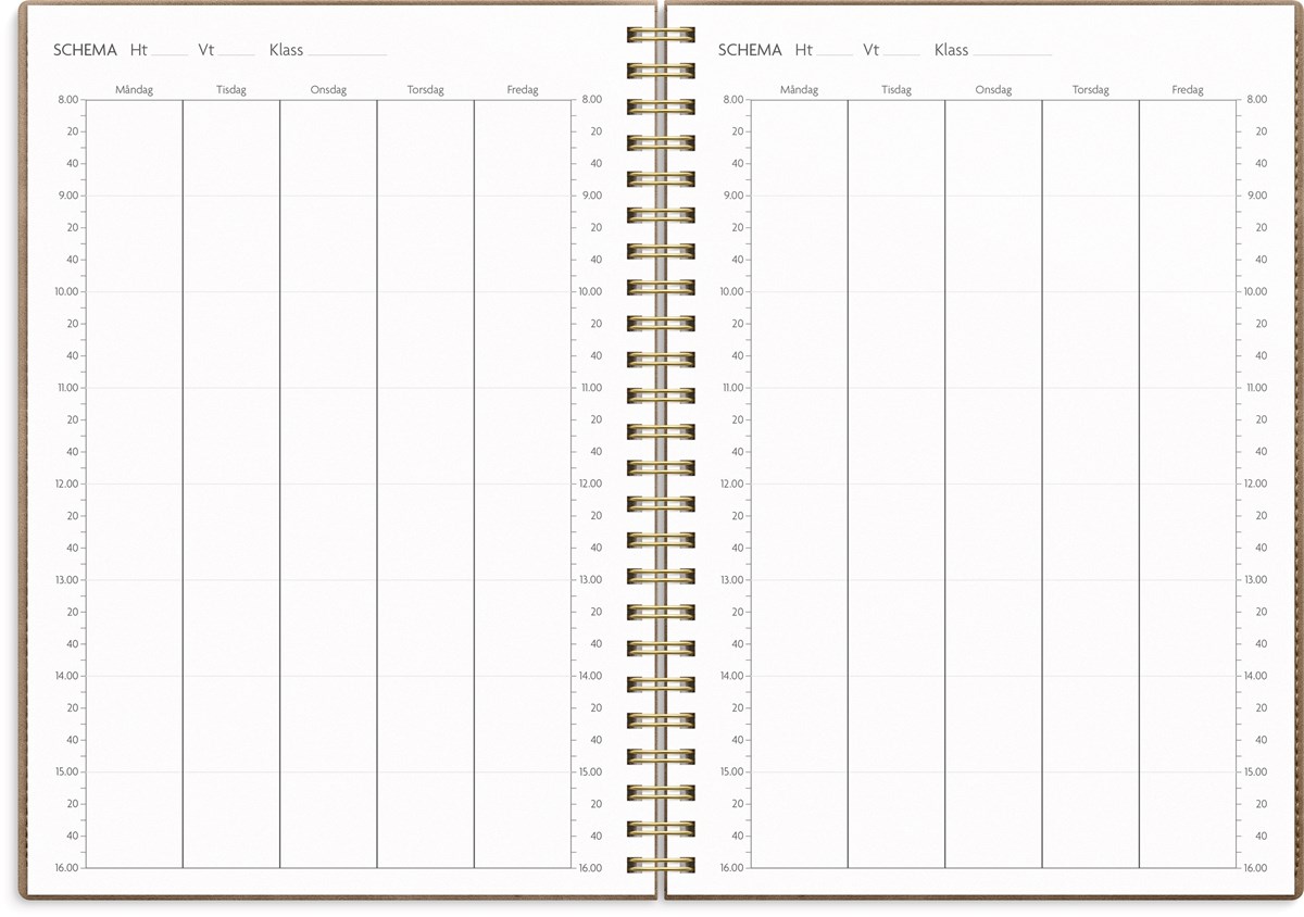 Format: A5. Mått: 215 x 163 x 17 mm. Layout: Vecka/uppslag. Stående. Timindelning 8-17. Kalendarium: 2026-06-01 - 2027-08-29. Omslag: Konstläder. Spiralbunden. Innehåll: Kyrkliga helgdagar, flaggdagar, helgdagar/aftnar, månfaser, namnsdagar, temadagar/händelser, årsplan/årsplaner, schema, provresultat. Antal sidor: 176. Miljöinformation: FSC® papper.