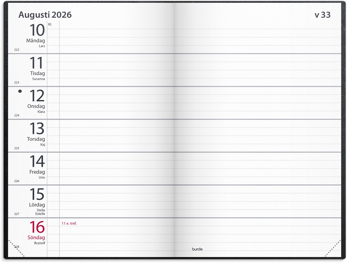 Format: 82x127 mm. Layout: Liggande. Vecka/uppslag. Kalendarium: 2025-12-15 - 2027-01-03. Omslag: Konstläder. Inbunden. Innehåll: Atlas, Kyrkliga helgdagar, Flaggdagar, Helgdagar/aftnar, Månfaser, Namnsdagar, Internationella helgdagar översikt, Löst telefonregister, Temadagar/händelser, Årsöversikt/årsöversikter, Årsplan/årsplaner. Antal sidor: 168. Miljöinformation: FSC®.