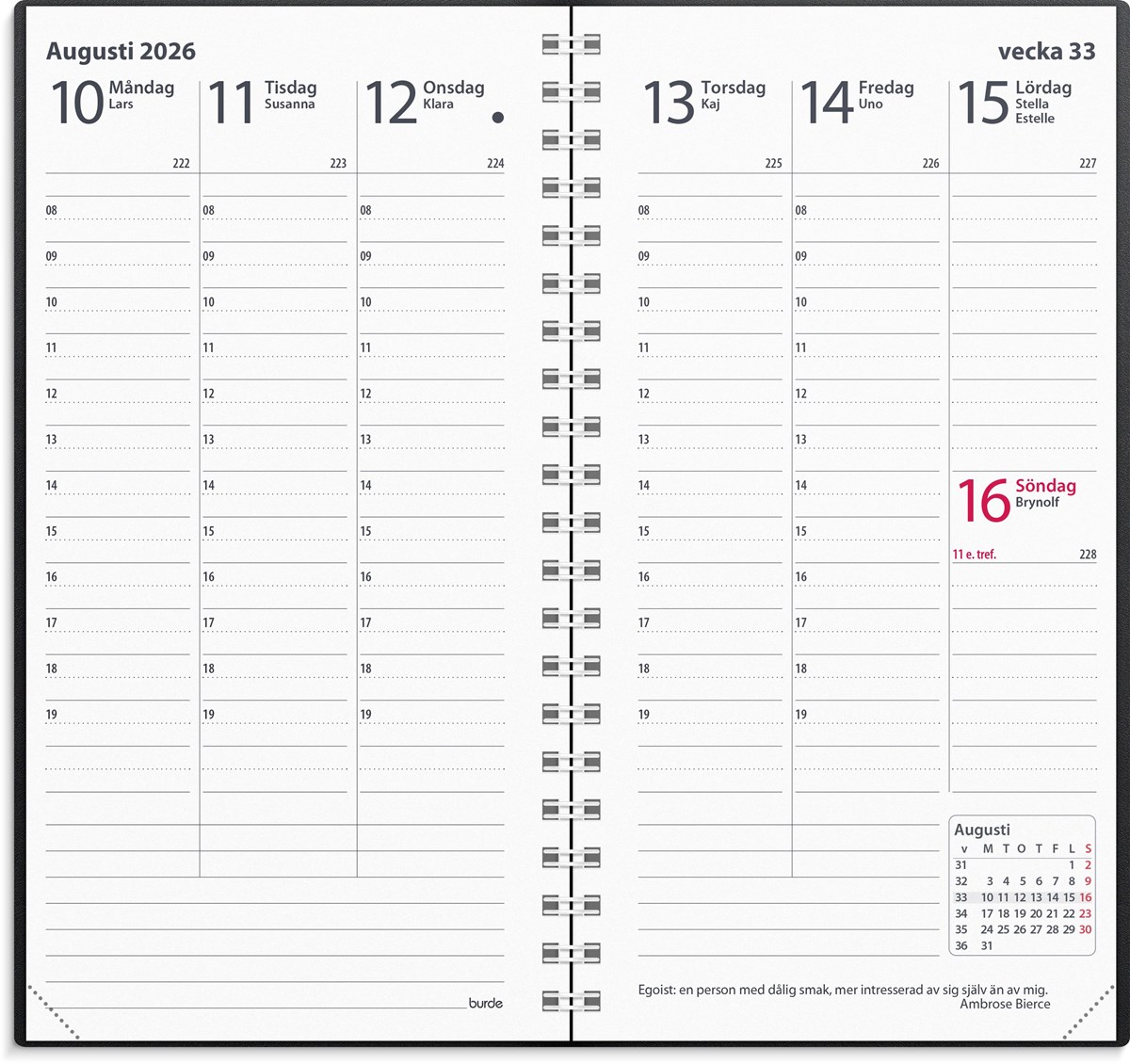 Format: 83x158 mm. Layout: Stående. Vecka/uppslag. Timindelning 8-19. Kalendarium: 2025-09-15 - 2027-03-14. Omslag: Plast. Spiralbunden. Innehåll: Kyrkliga helgdagar, Flaggdagar, Helgdagar/aftnar, Månfaser, Namnsdagar, Internationella helgdagar översikt, Telefonregister, Temadagar/händelser, Årsöversikt/årsöversikter, Årsplan/årsplaner. Antal sidor: 160. Miljöinformation: FSC®.