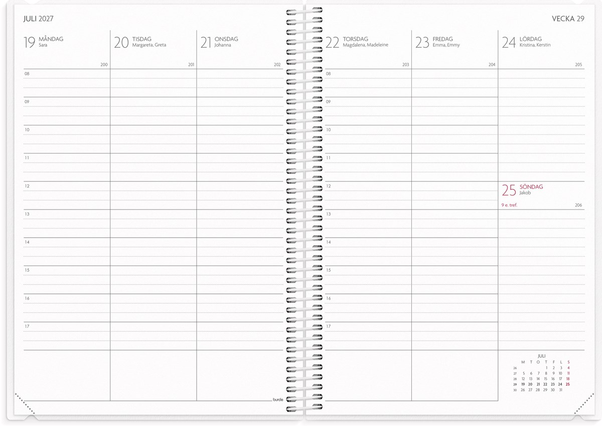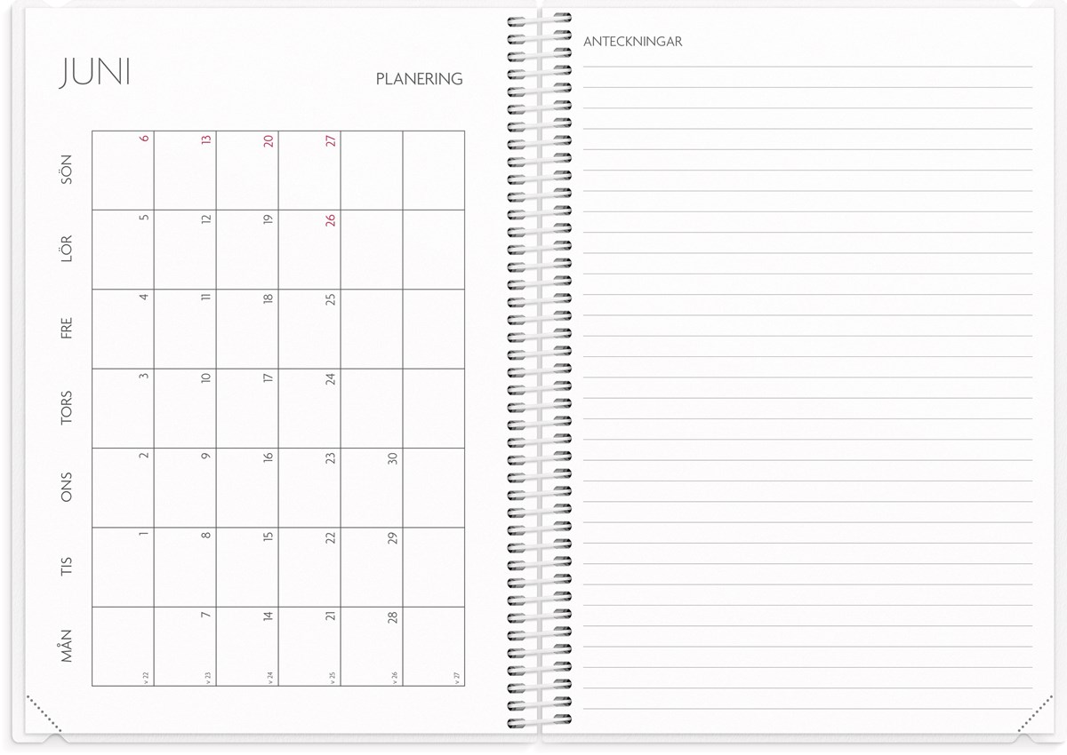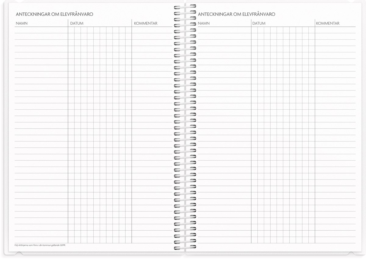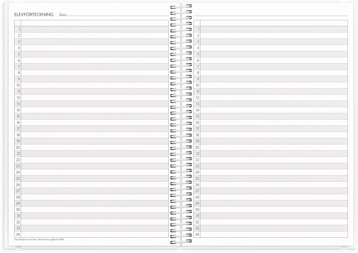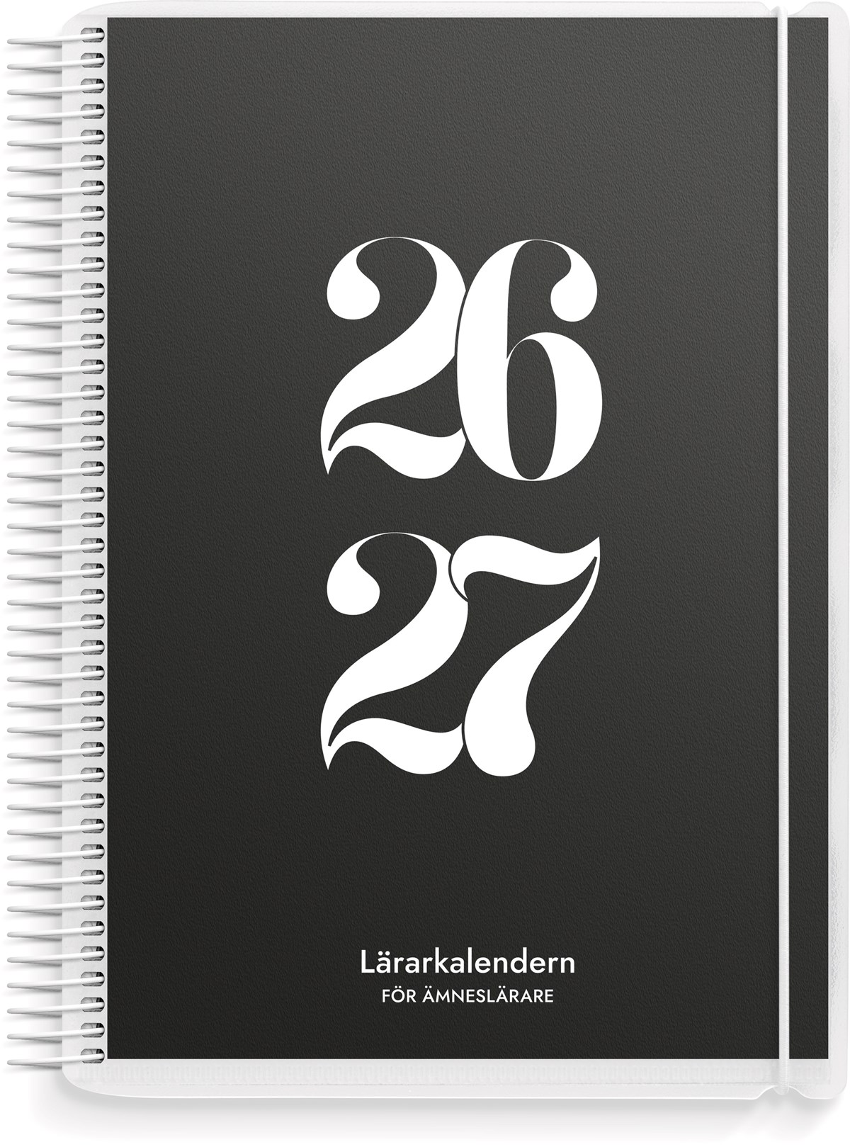 Format: A5. Mått: 160 x 215 x 15 mm. Layout: Vecka/uppslag. Stående. Timindelning 8-17. Kalendarium: 2026-06-01 - 2027-08-29. Omslag: PP-plast och plastficka med tryckt blad. Spiralbunden. Detaljer: Gummiband. Flyttbar plastlinjal. Plastficka. Innehåll: Kyrkliga helgdagar, flaggdagar, helgdagar/aftnar, månfaser, namnsdagar, temadagar/händelser, årsplan/årsplaner, kontaktlista, utvikbar namnlista, anteckningssidor, schema, elevfrånvaro, elevförteckning, provresultat. Antal sidor: 232. Miljöinformation: FSC®.