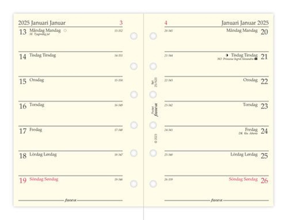 Dagbok med en vecka per sida, två veckor per uppslag. Trespråkig kalender, svenska, danska och norska.