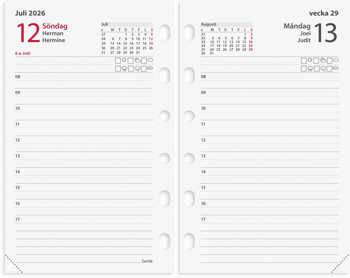 Hålad kalenderrefill till systemkalender med ringmekanism.
