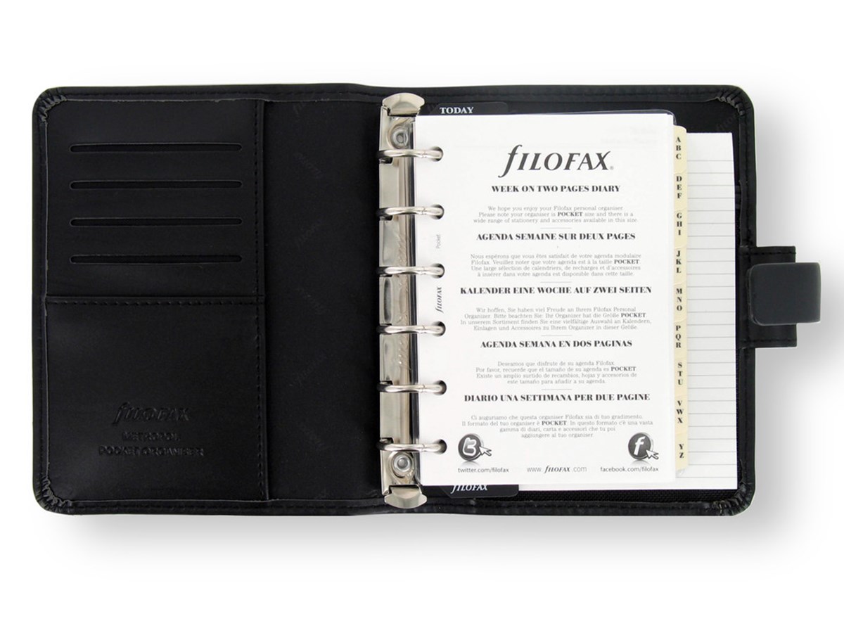 Metropol, enkel och snygg design i läderlikt konstmaterial. En smart och praktisk systemkalender för daglig användning. 19 mm ringmekanism. Pappersstorlek: 81x120 mm. Pärmstorlek: 148x128x40 mm.