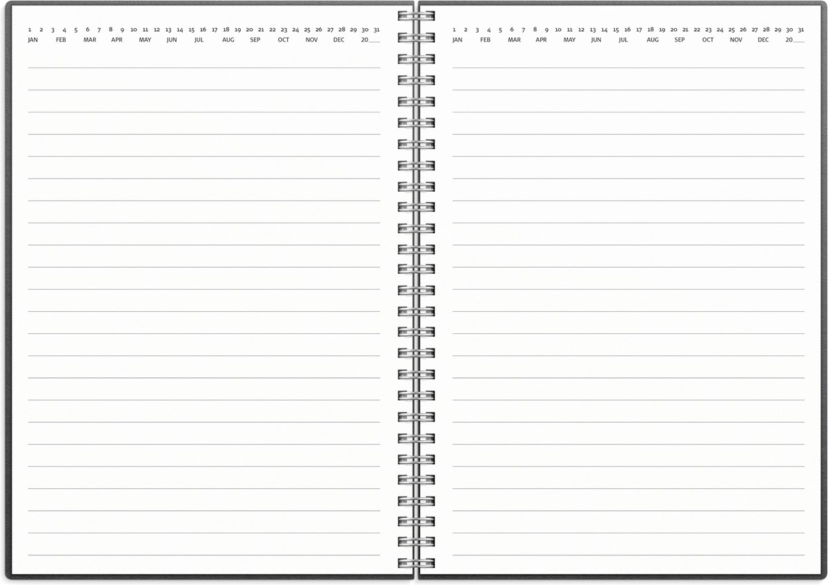 Omslag i kartong. Linjerad, datumrad, 80g, 80 blad. Spiralbunden. Passar Stora Noteskalendern. Format: A5.