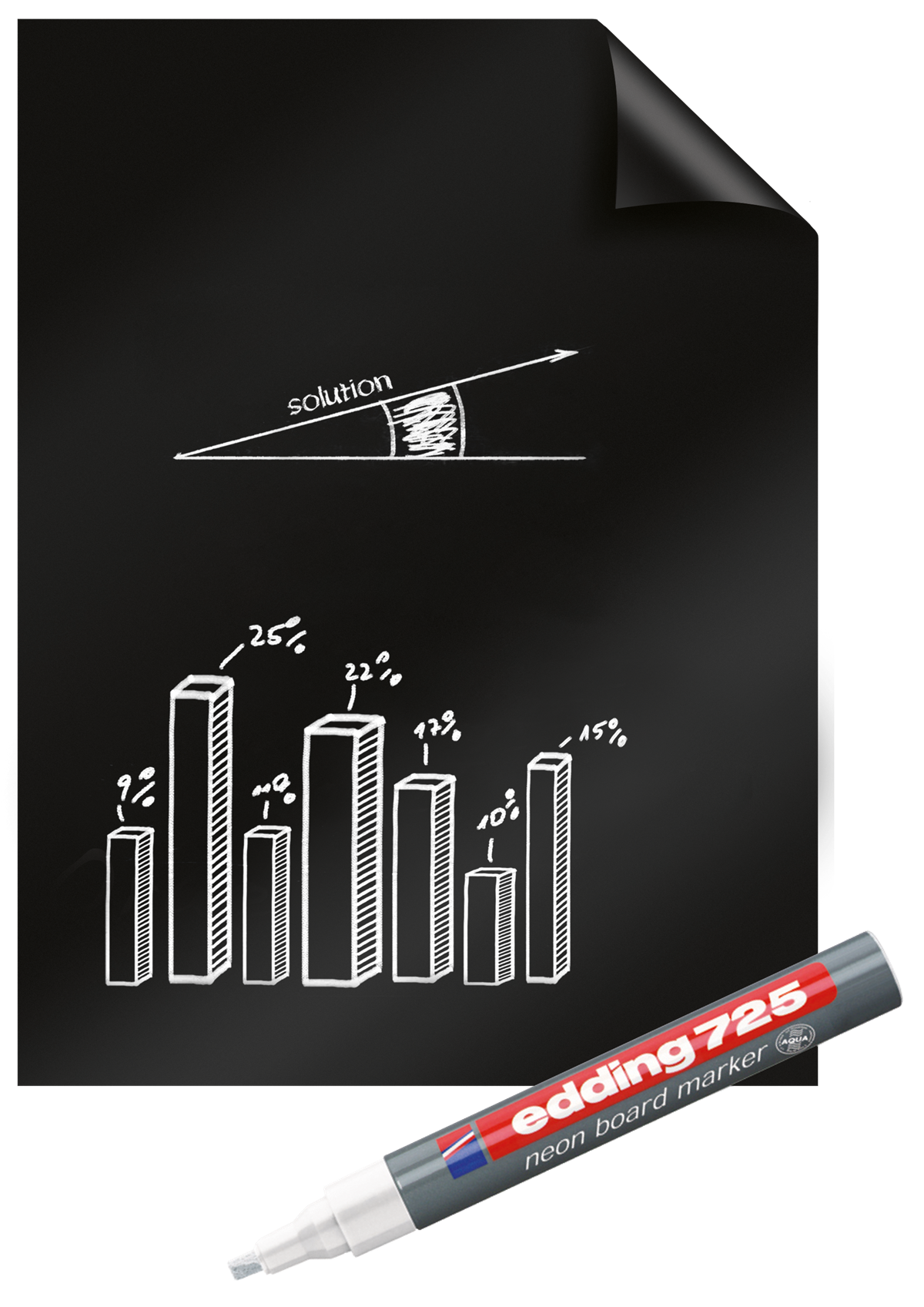 Lättanvänd statisk film som liknar blackboard. Håller fast som magi på alla plana ytor (trä, betong, glas, tapeter). Lätt att placera om och ta med sig efter mötet. Inget klister krävs, lämnar inga spår. Kan skrivas på med Edding permanenta chalk marker (1 penna ingår). Rullbredd 60 cm, perforering varje 80 cm, 25 ark. Miljövänlig, helt återvinningsbar folie.