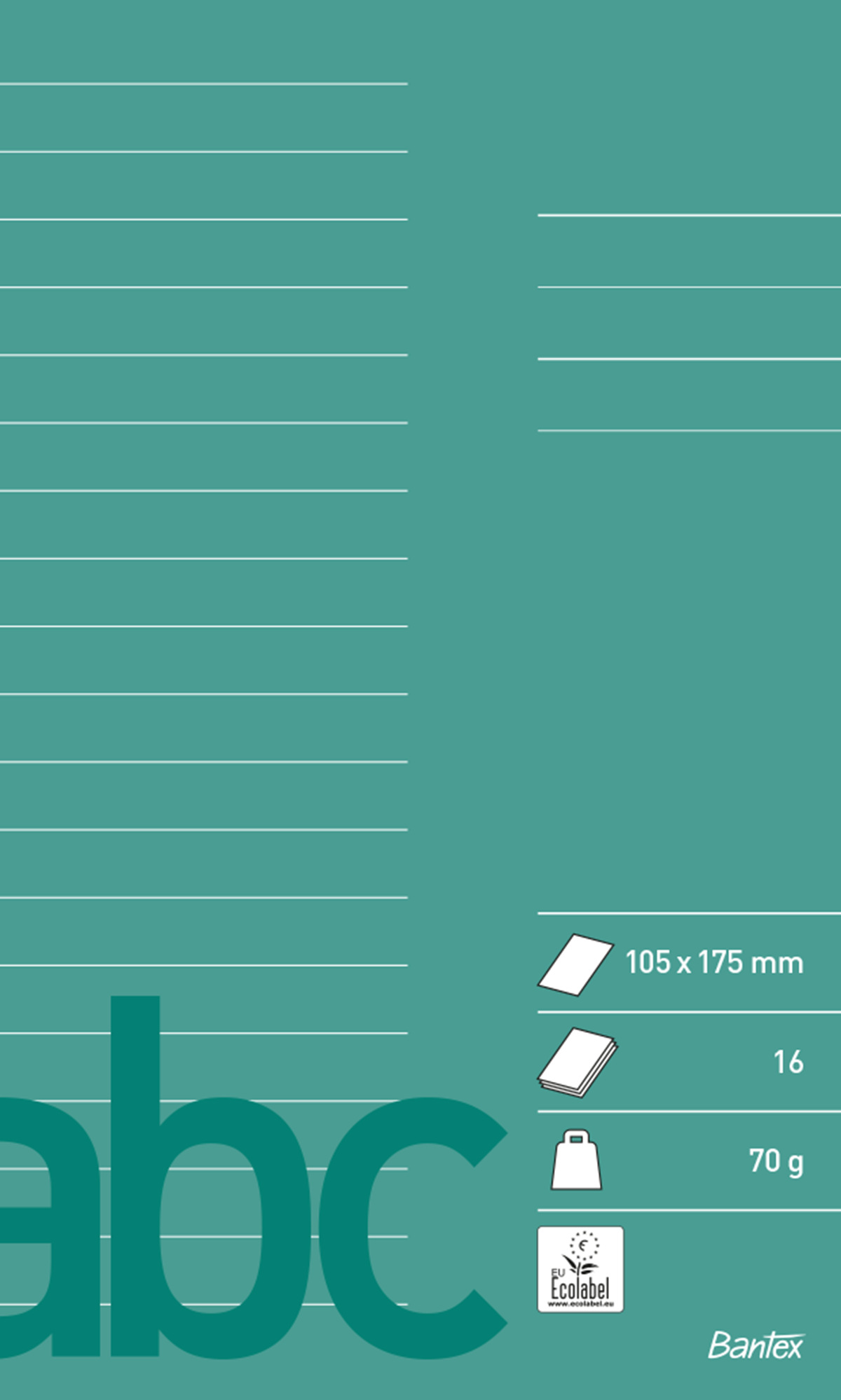 Skolhäfte tillverkat av 70 g papper. Mått: 102 x 170 mm. Linjeringsdetaljer: 7 mm / 21 linjer, utan mittlinje. 16 blad.