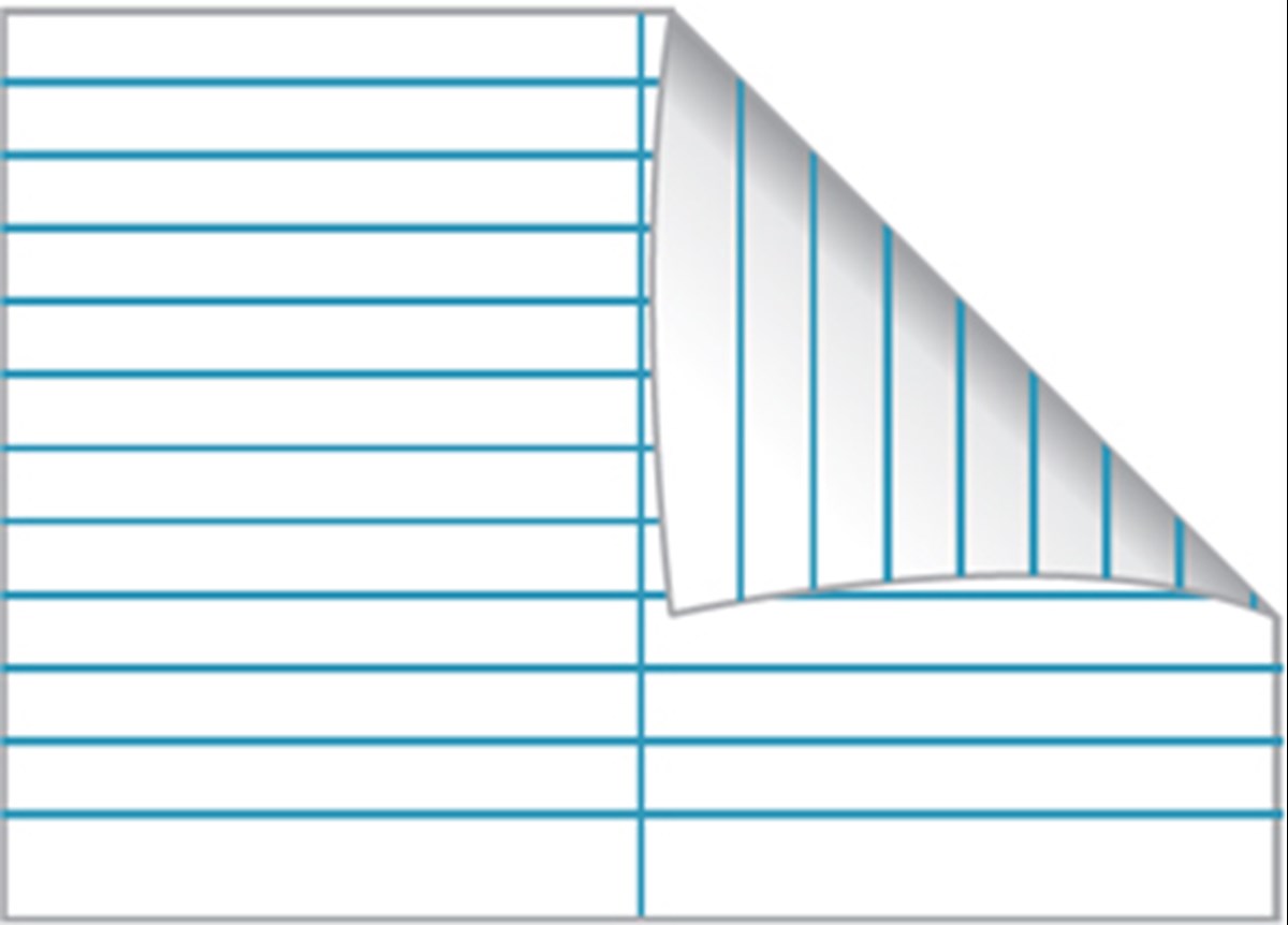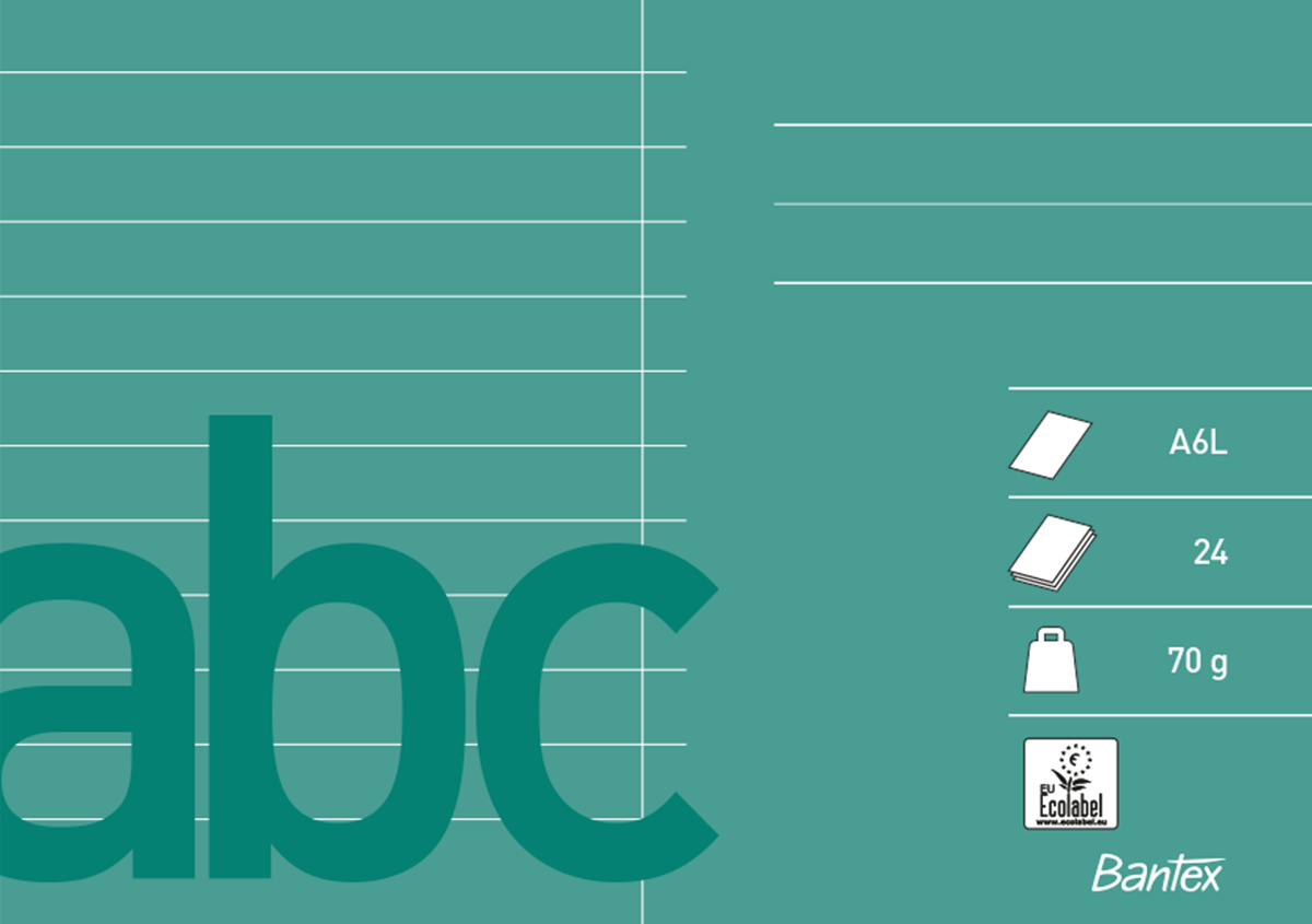 Tillverkat av 70 g papper. Med en lodrät linje mitt på varje sida. 24 blad. Linjerat 7 mm.